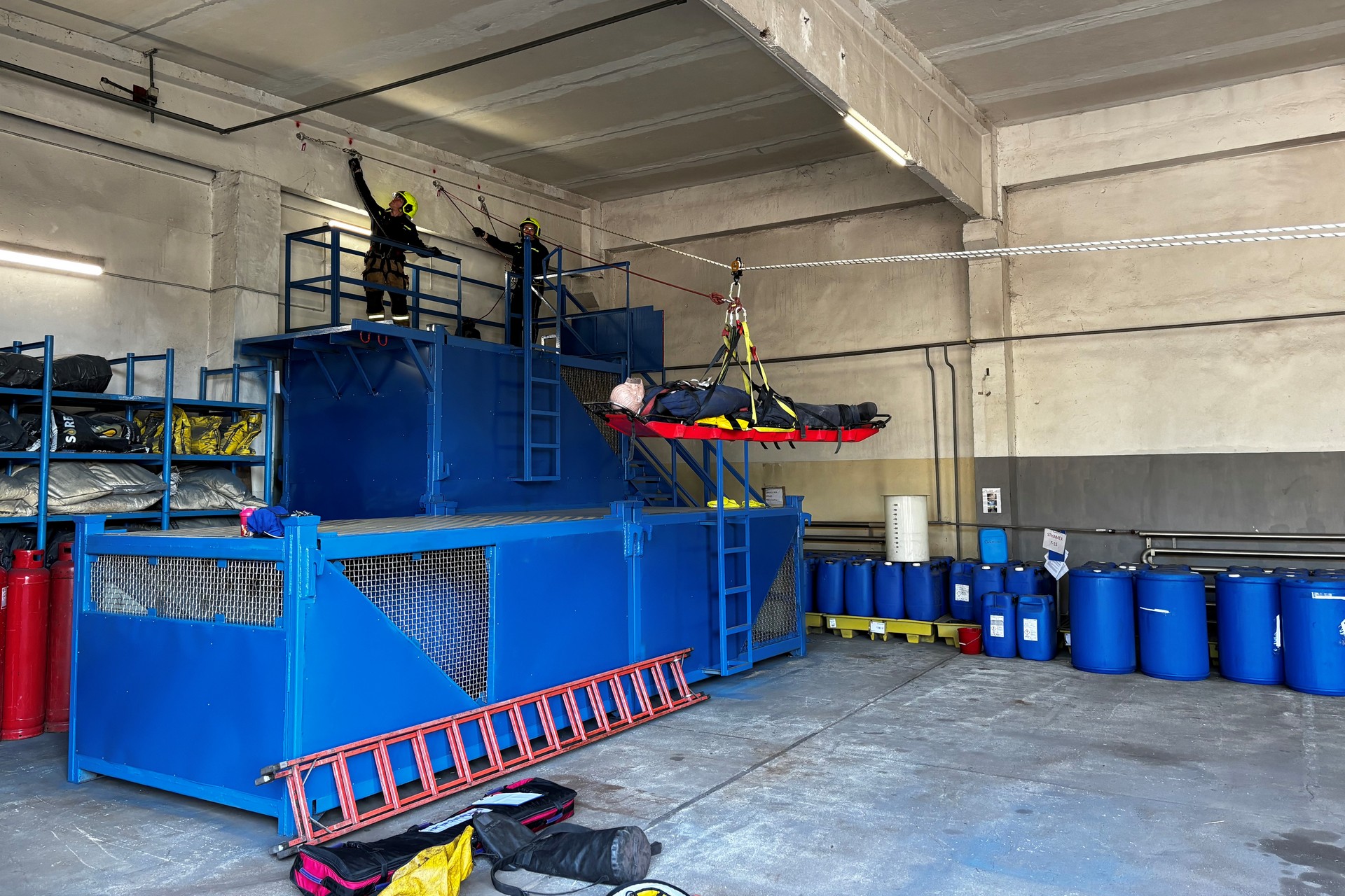 Some time ago, we had a real intervention in which we used climbing equipment in DZ Oceliareň. The man was stuck in a cascade two floors below in the technology, from where he had to be evacuated. We had to use several techniques and make anchor points in different places. It was a complicated intervention and we managed to simulate similar conditions in this polygon of ours.