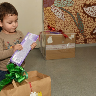 Three-year-old Julko was so overwhelmed by the package that he held his head, as if what he was seeing was impossible.