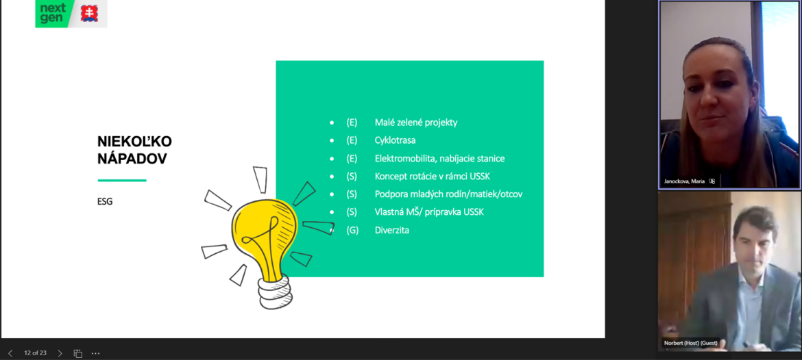 The lead speaker at the session was Norbert Kurilla, special adviser to the President of the Slovak Republic Zuzana Čaputová. He mentioned various activities of the President's Office related to carbon production and several ways of reducing the Office's carbon footprint. Through the application of modern technologies, creating a green roof and planting trees, the President's Office has got down to the level of 1.6 tons of CO2 per annum, and is surely the leader in such environmental efforts among all the state institutions in Slovakia.