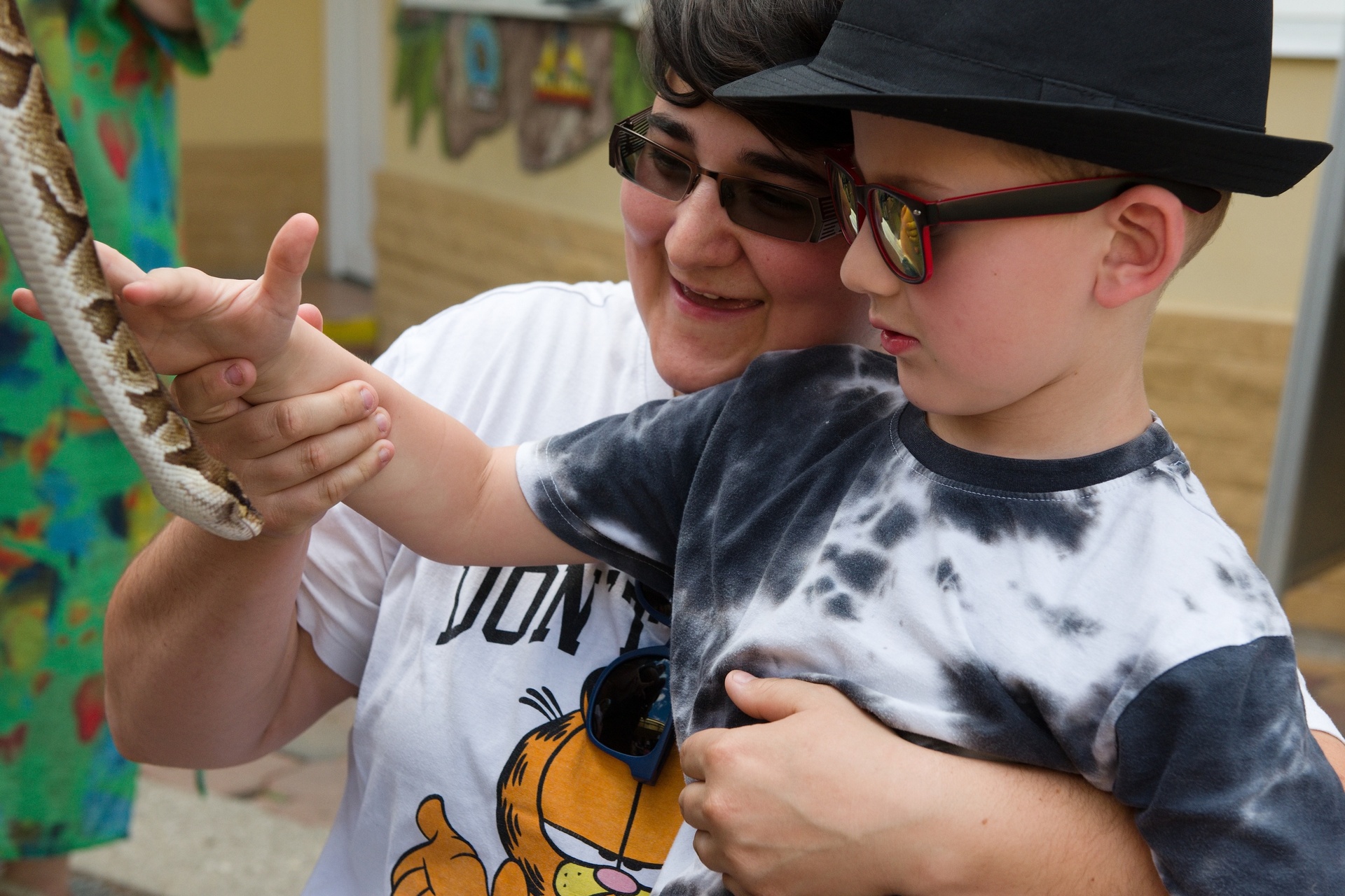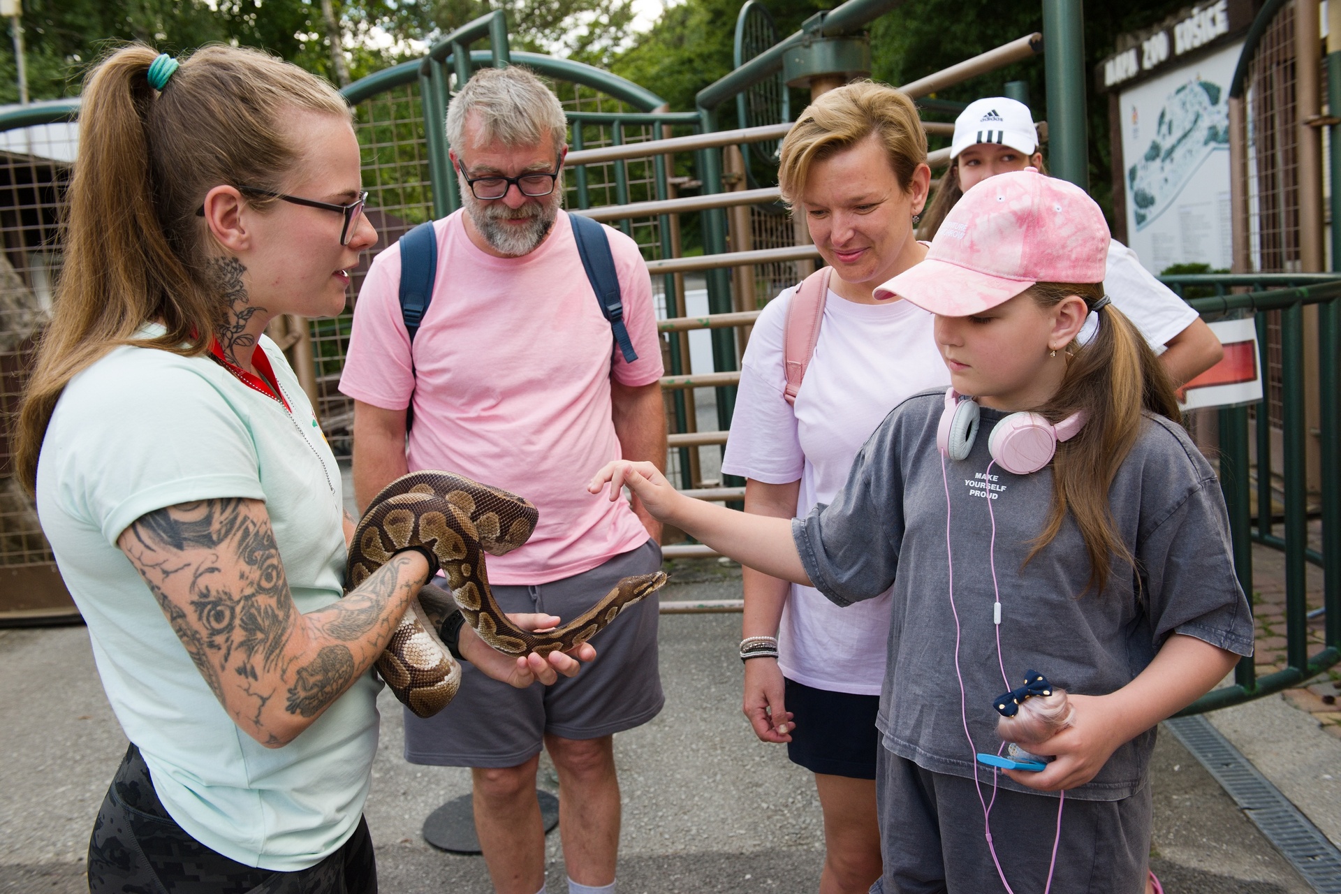 The family of Peter Veliký was the first to pet the animal brought. The "animal" was a royal python and they decided to pet it after our guide assured them that this snake is not poisonous, it is "just" a strangler. The wife of the deputy president of U. S. Steel, Allison Revello, also took the opportunity to touch the snake. As she told us, she loves animals very much, she even dreamed of becoming a veterinarian as a child. Her favorite animals are cats and currently especially one of her neighbors, who regularly visits them.