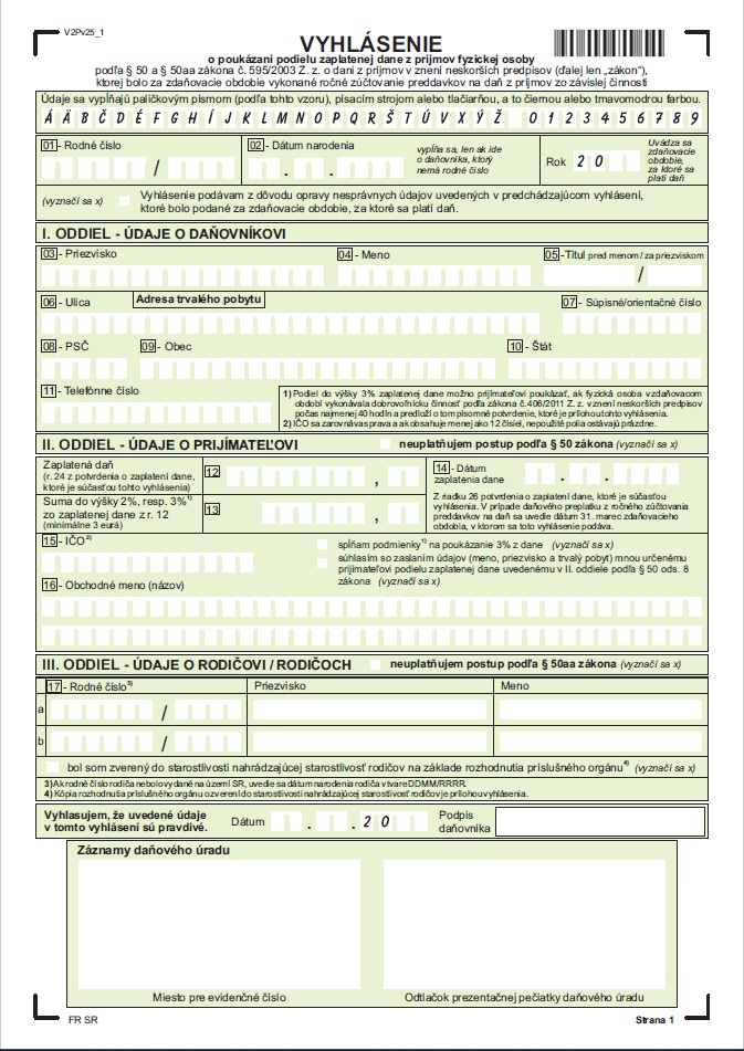 Samostatné tlačivo vyhlásenia o poukázaní podielu zaplatenej dane použije na poukázanie 2 % rodičom iba tá fyzická osoba, ktorá nepodáva daňové priznanie k dani z príjmov za rok 2025 a zamestnávateľ jej vykonal ročné zúčtovanie preddavkov na daň z príjmov zo závislej činnosti. Vyhlásenie o poukázaní podielu zaplatenej dane je možné podať na ktoromkoľvek daňovom úrade, jeho pobočke alebo kontaktnom mieste v lehote do 30. 4. 2026.