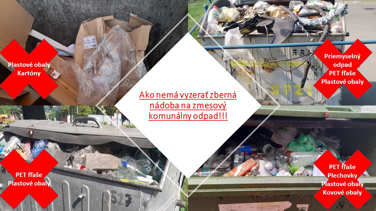Na obrázku je zobrazený stav, ako nemá vyzerať zberná nádoba na zmesový KO. Naopak, na titulnej fotke je príklad správneho triedenia KO.