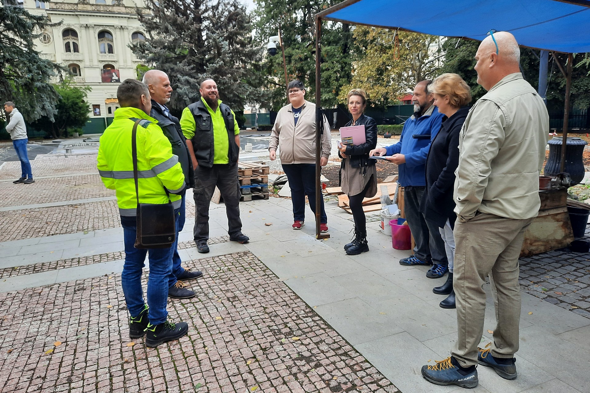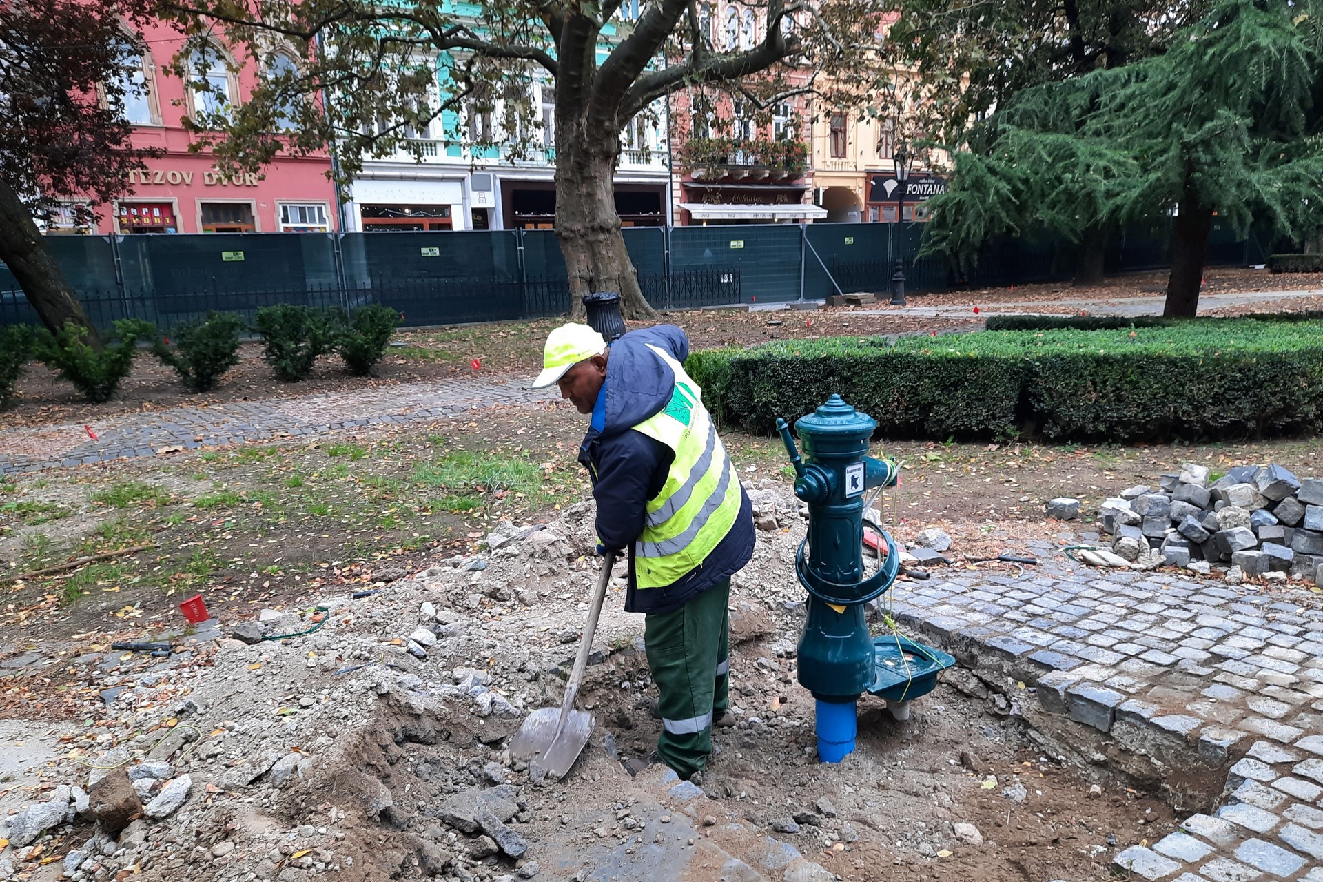 Plot okolo parku a fontány bude odstránený po odovzdaní stavby prípadne v priebehu kolaudačného konania a zelené plachty inštalované na oplotení okolo fontány bude možné odstrániť až po ukončení skúšobnej prevádzky a protokolárnom odovzdaní stavby.