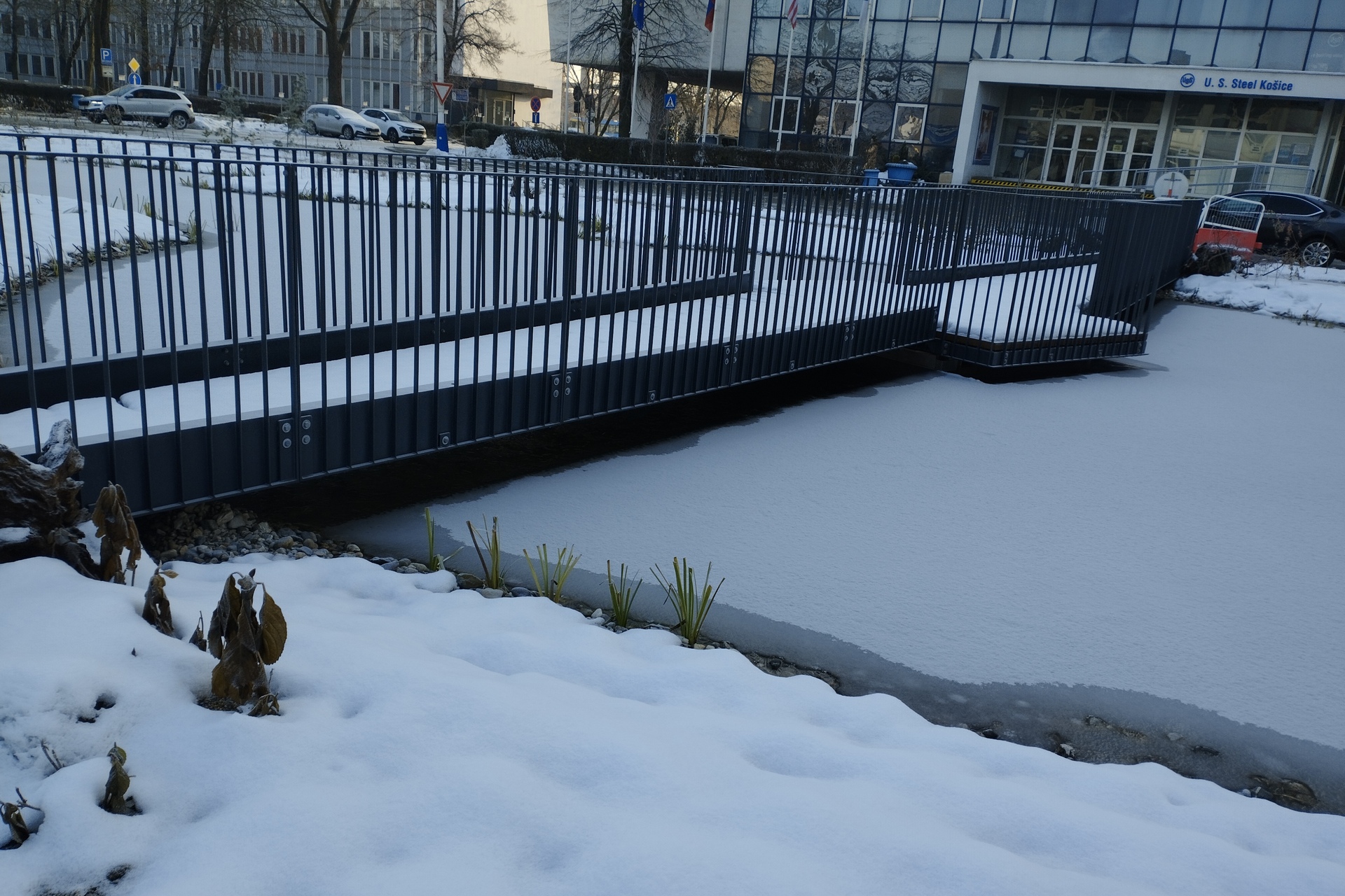 Jazierko, ktoré na nepoznanie zmenilo ráz priestoru pred hlavnou administratívnou budovou vo Vstupnom areáli U. S. Steel Košice, pokryl sneh, časť vody zamrzla. Je to v poriadku keďže v ňom už plávali ryby? Pýtajú sa mnohí košickí oceliari prechádzajúci okolo.