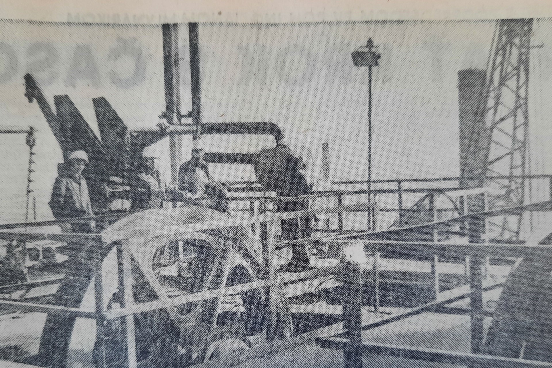 Ponúkame vám pohľad na najvyšší bod vysokej pece 2. Nad toto plošinou, kde sú umiestnené kladky skipov, už trčí iba otočný, konzolový žerav, ktorý ta namontovali montéri z Čadce, robiaci v Hutných montážach. Na obrázku vidíte skupinu ostravských montérov dokončujúcich vo výške 82 metrov posledné úpravy.