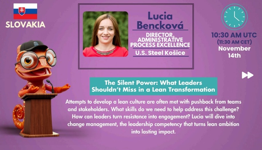 Slovensko zastupovala Lucia Bencková, riaditeľka pre zdokonaľovanie administratívnych procesov z našej spoločnosti. Je hrdá na to, že mohla so svojou prezentáciou reprezentovať nielen našu firmu, ale aj našu krajinu na celosvetovom podujatí, na ktorom vystúpili aj dvaja z najvýznamnejších svetových guru lean metodológie John Shook a Jim Womack.