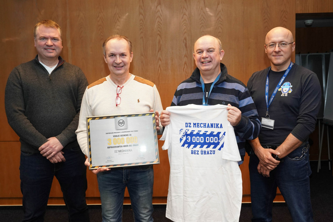 Zastupujúci prezident Mike Piekut, viceprezident pre výrobu Marcel Novosad a GM pre bezpečnosť a ochranu Robert Meitner dnes odovzdali diplom a symbolicky aj tričko riaditeľovi DZ Mechanika Jurajovi Prokeinovi k významnému míľniku, ktorý tento závod dosiahol 29. novembra minulého roka.