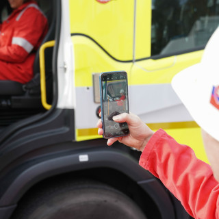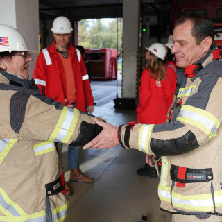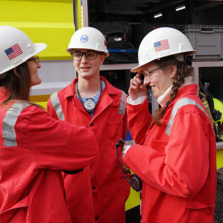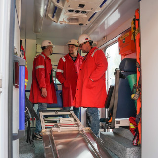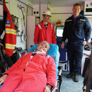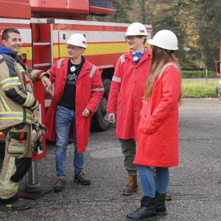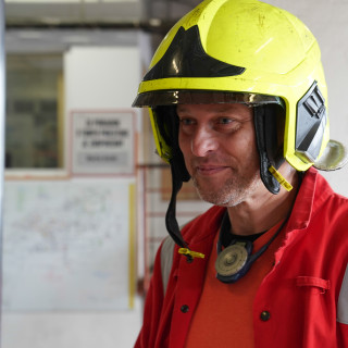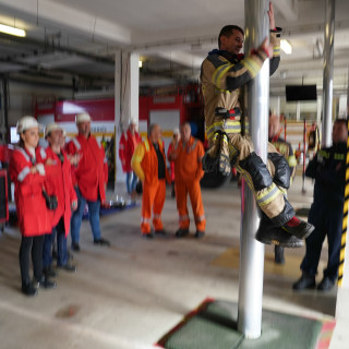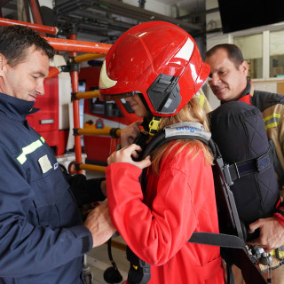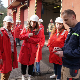 Po úvodnom filme a bezpečnostnom školení si každý z účastníkov obliekol potrebné ochranné pomôcky. To bolo dôvodom na prvé úvodné fotenie v prilbe, ochrannom červenom plášti, či pracovných topánkach s oceľovou špicou.