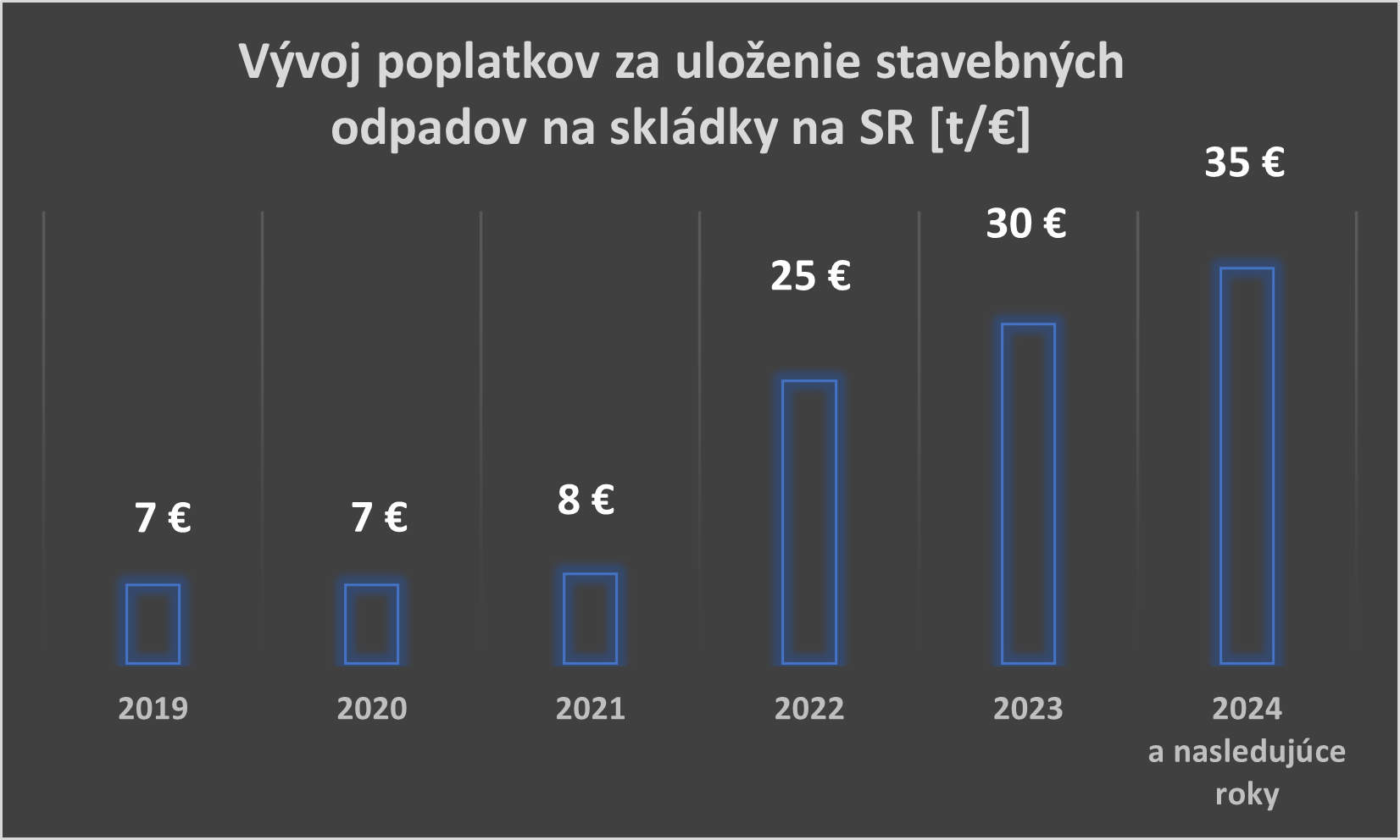 Tieto povinnosti odzrkadľujú potrebu zvýšenia miery recyklácie stavebných odpadov, čo podporila aj novela nariadenia vlády č. 330/2018 Z. z. ktorým sa ustanovuje výška sadzieb poplatkov za uloženie odpadov. V uvedenom nariadení došlo v roku 2022 oproti roku 2021 k 3-násobnému nárastu poplatkov za skládkovanie stavebných odpadov (viď. graf nižšie).