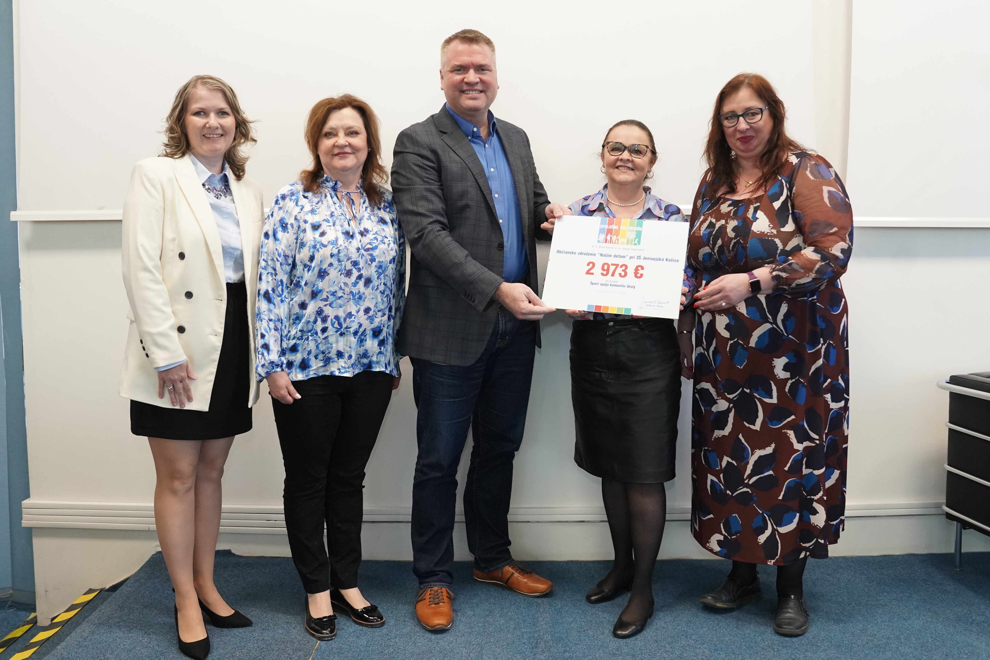 Na fotografii pri odovzdávaní symbolických šekov v rámci grantového programu Spoločne pre región: Jana Nováková, Renáta Miklošová z OZ a učiteľka ZŠ, zastupujúci prezident USSK Mike Piekut, Miroslava Heželová z OZ a učiteľka ZŠ a riaditeľka ZŠ Lucia Grünwaldová.