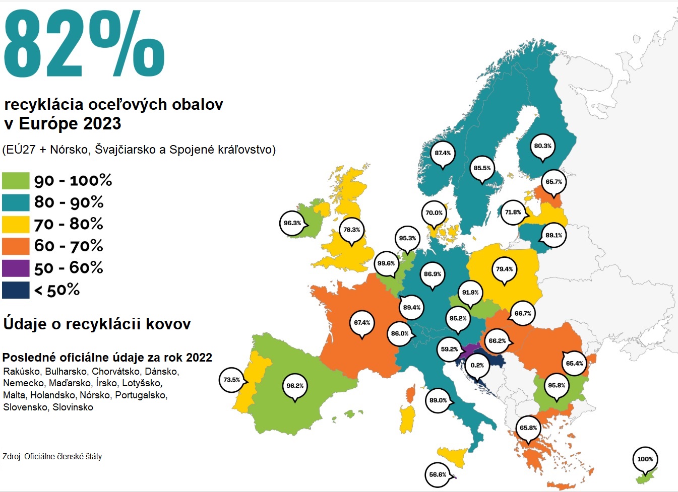 Najnovšie nezávisle overené údaje vypočítané podľa harmonizovanej metodiky EÚ, dokazujú, že 82% oceľových obalov uvedených na trh bolo v roku 2023 skutočne recyklovaných. Táto informácia len potvrdzuje, že oceľové obaly zostávajú najviac recyklovaným obalovým materiálom v Európe, ktorý už spĺňa najprísnejšie kritériá recyklovateľnosti stanovené v Nariadení o obaloch a odpade z obalov (PPWR). Táto rekordná miera recyklácie predstavuje nárast o 2 percentuálne body v porovnaní s rokom 2022, čo zdôrazňuje zásadnú úlohu oceľového šrotu, ktorý je nevyhnutný pre udržateľnú výrobu nových výrobkov z ocele. Výroba a používanie obalovej ocele v EÚ je vynikajúcim príkladom obehového hospodárstva - šetrí zdroje, spotrebu energie, znižuje emisie, pomáha udržiavať potravinovú bezpečnosť a tým aj predchádzať plytvaniu potravinami.