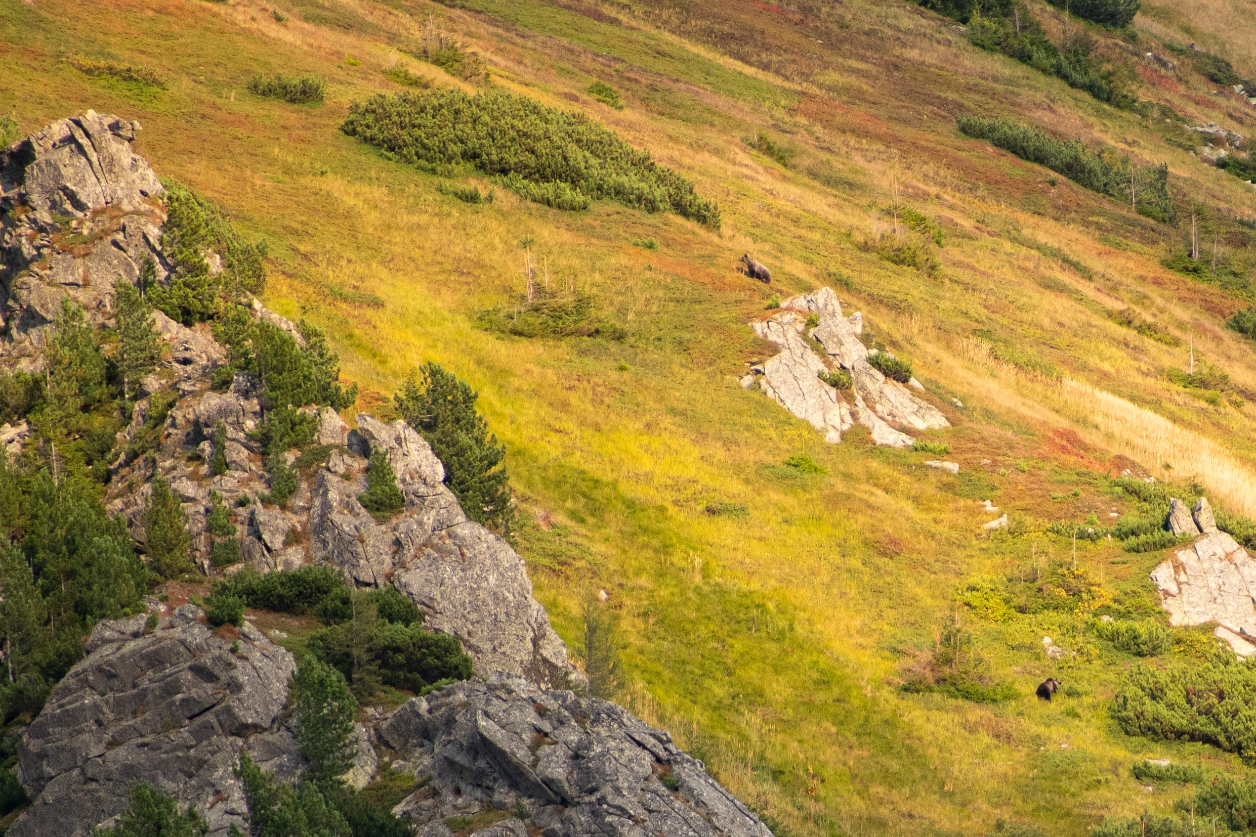 Medvede sú ďalším fascinujúcim obyvateľom Tatier. Hoci sú plaché a väčšinou sa vyhýbajú ľuďom, s trochou šťastia a trpezlivosti ich môžete zahliadnuť. Najlepšie obdobie na pozorovanie medveďov je práve koncom leta, keď sú aktívnejšie pri hľadaní potravy. Tu však už treba mať lepšie oči a trpezlivosť. Ak máte po ruke ďalekohľad, tak si ten zážitok naozaj vychutnáte. Nám sa podarilo nafotiť a pozorovať medvediu rodinku s jedným tmavým a jedným svetlým mláďaťom (mali sme pri sebe iba 300 mm objektív a chcelo by to lepší... ), a tiež dvoch statnejších mackov v zápale kŕmenia sa.
