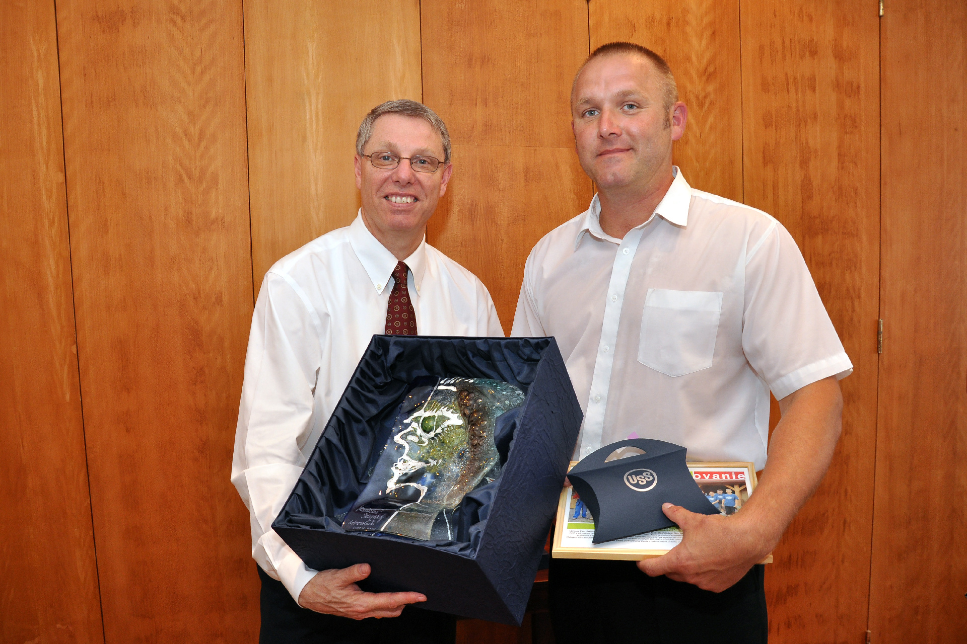 My len pripomíname, že hoci bol náš kolega Rasťo Šelepský tentokrát ocenený v rámci celej korporácie United States Steel, Dobrovoľníkom roka v U. S. Steel Košice sa stal už v roku 2011 (na snímke s vtedajším prezidentom USSK Davidom Rintoulom).
