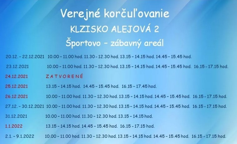Aj keď je snehu pomenej, vďaka Športovo-zábavnému areálu na Alejovej sa dá naďalej korčuľovať. Odporúčame však prísť približne o 20 až 30 minút skôr, pretože do areálu je možné pustiť maximálne 53 osôb v režime OP. Ak si budete odrátavať stojacich pred vami, tak počítajte len tých s korčuľami.