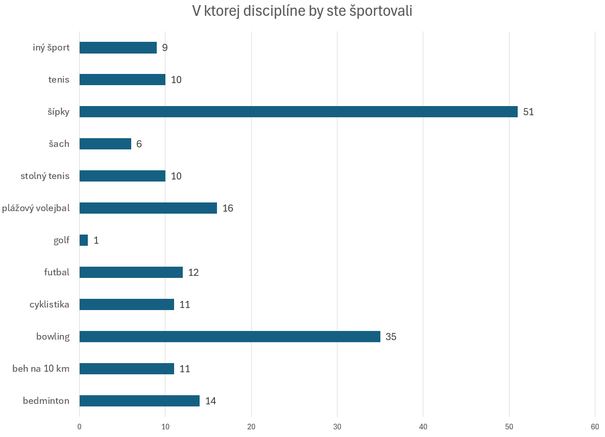 Do našej ankety k účasti na Letných športových hrách sa zapojilo 119 kolegov. Ďakujeme za vaše odpoveďe a aj nové tipy na ďalšie športy, ktorým sa venujete. Z výsledkov ankety nám vyšlo, že šípky budú populárne aspoň tak, ako je bowling. Prišlo nám aj pár zaujímavých tipov na nové disciplíny, ako sú: streetbasket, kolky, plávanie, petang, biliard, discgolf, poker ale aj športový rybolov. V nasledovných grafoch sú spracované vaše odpovede.