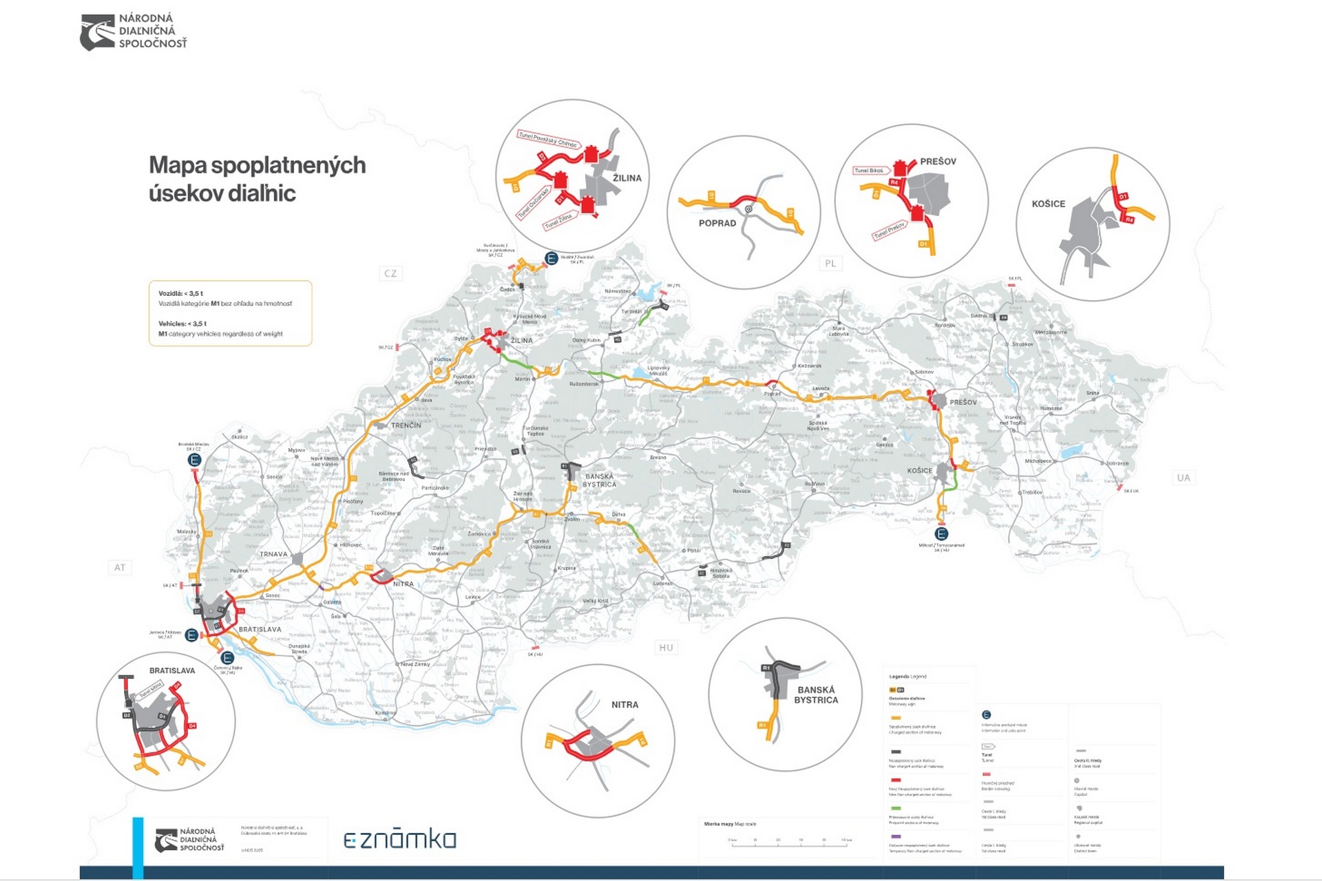 Mapa spoplatnených a nespoplatnených úsekov diaľnic