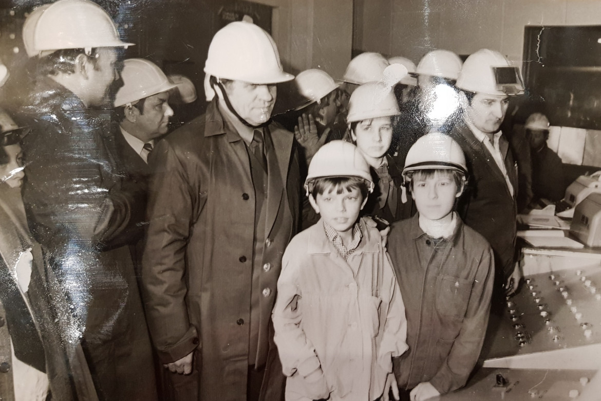 Na fotografii sú aj dvaja chlapci. Ten vľavo je Marek Sabol, ktorý mal vtedy 8 rokov. Vo fabrike pracuje dodnes, ako majster údržby Oceliarne1 - I.