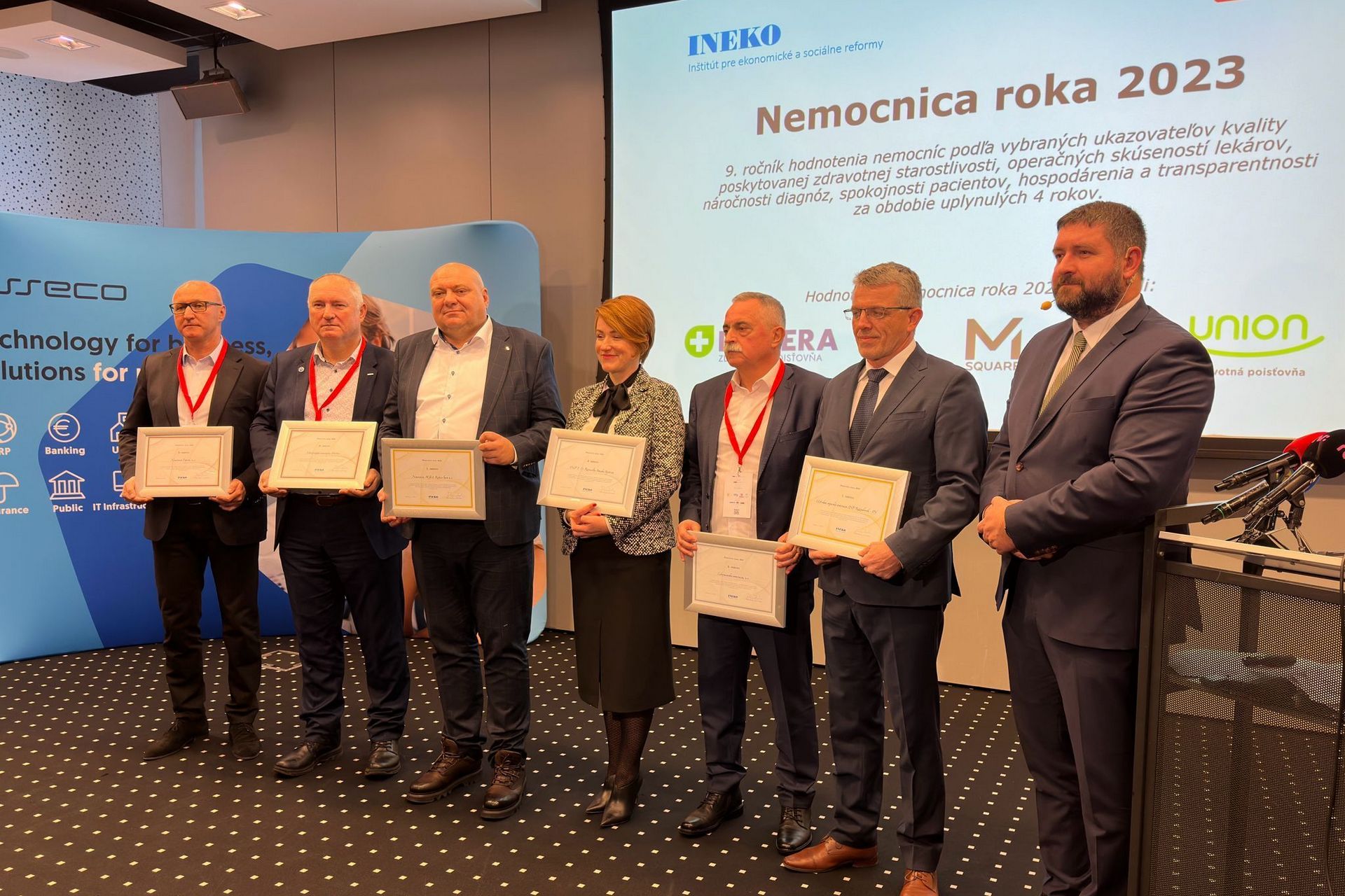 „V poradí už piaty titul Nemocnica roka v kategórii všeobecných nemocníc prijímame s obrovskou vďakou, pokorou a zodpovednosťou. Som presvedčený, že za týmto výsledkom je vytrvalá práca celého kolektívu. Úspech veľkej inštitúcie totiž záleží od každodenných drobných činností jednotlivcov, ich zodpovednosti a precíznosti, s ktorou k svojej práci pristupujú a nepoľavujú ani v krízových situáciách,“ uviedol okrem iného na margo ocenenia generálny riaditeľ Nemocnice AGEL Košice-Šaca MUDr. Pavol Rusnák, MBA (na snímke tretí zľava).