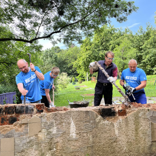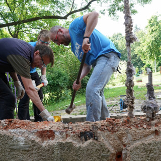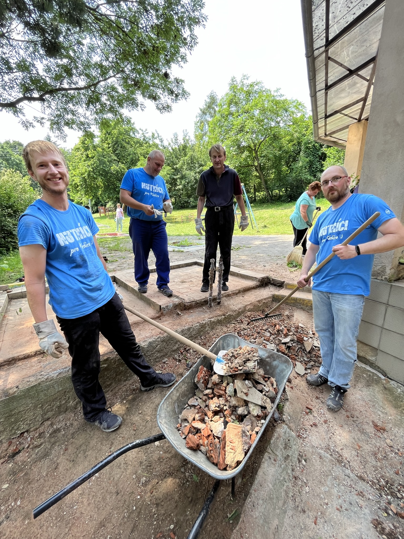 Ďalšou aktivitou bola likvidácia múrika, na ktorej pracovali Martin, Martin a Peter. Chlapi sa museli poriadne zahryznúť do tejto činnosti, kde zužitkovali rôzne druhy zručností. Fotka zachytáva poslednú fázu búrania a upratovanie sute. Dávam do pozornosti Martinov úsmev, ktorý podčiarkuje výsledok tvrdej práce.