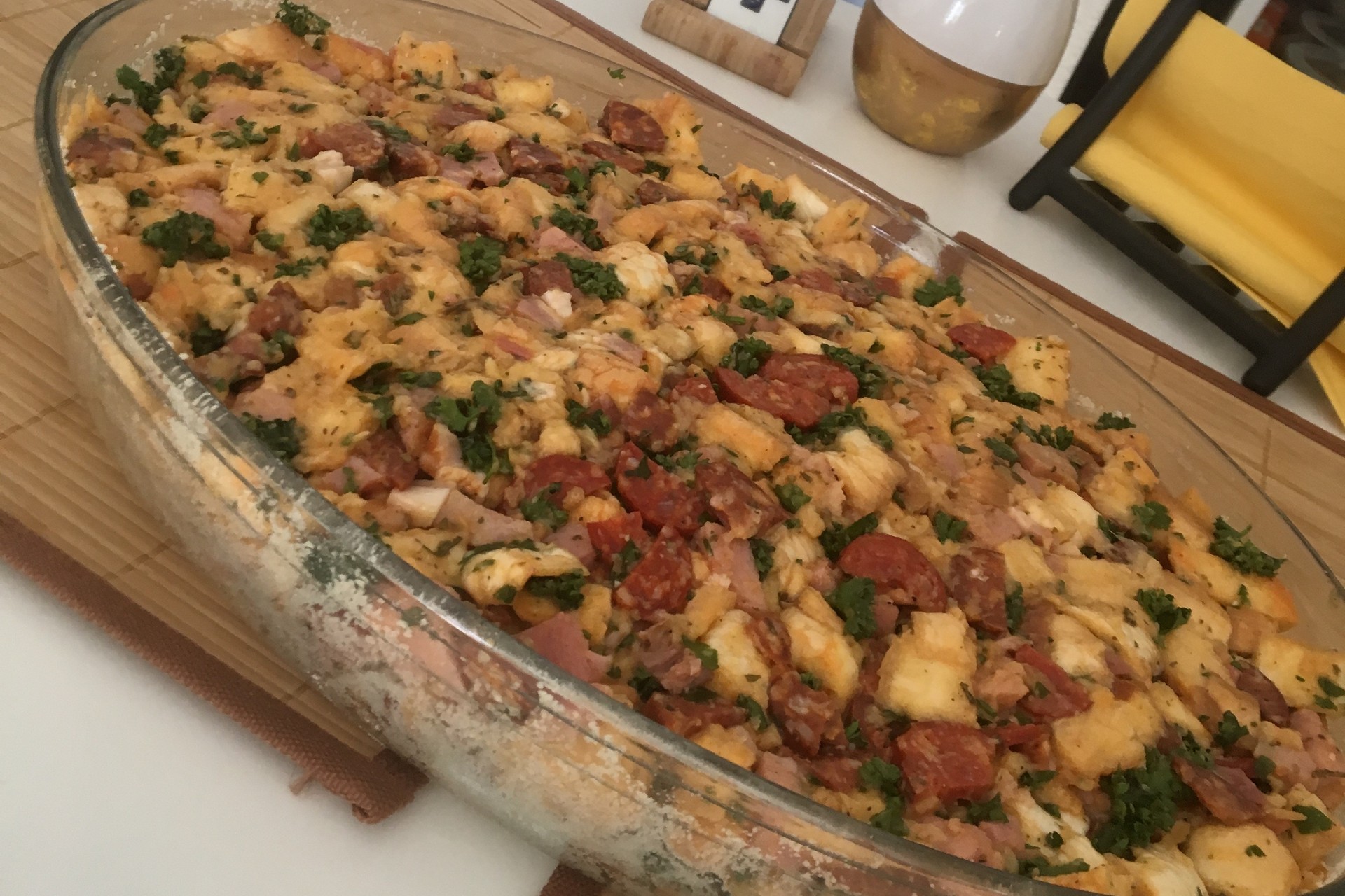 Postup: Staršie rožky nakrájame na tenučké kúsky. Nakrájame klobásku, špekačky, údeniny, slaninku – podľa chuti - na pekne úhľadné kúsky. Pridáme nadrobno nakrájanú petržlenovú vňať. Rozhabarkujeme vajíčko s troškou prášku do pečiva - polejme – aby bolo všetko vláčne. Osolíme, okoreníme. Vložíme do vymastenej zapekacej misky, alebo použijeme papier na pečenie. Pečieme kým nie je vrch upečený dozlatista