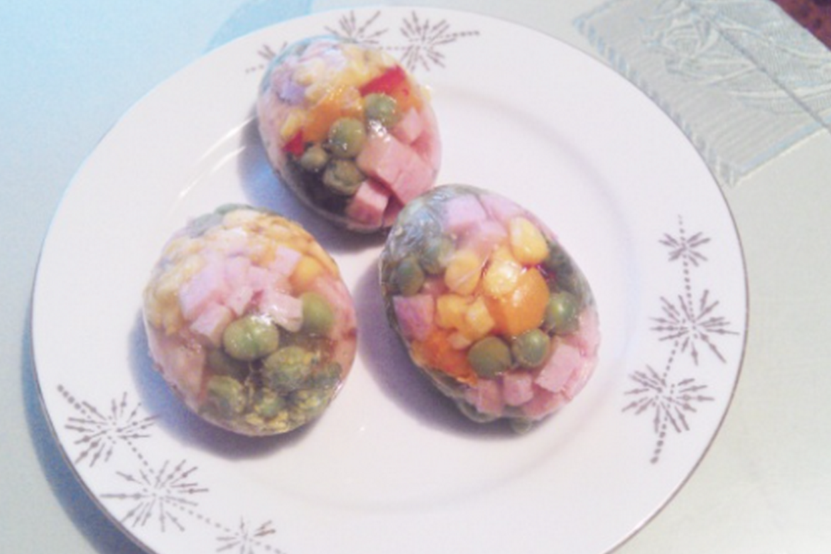 Postup: Najprv si vyfúkneme vajíčka, tak že len z jednej strany - špičky urobíme dierku, ktorú môžeme zväčšiť až tak, aby sa cez ňu dali prepchať jednotlivé suroviny. Potom do vajíčok navrstvíme ľubovoľne šunku, kukuricu, hrášok, kapiu a petržlenovú vňať. Pripravíme si želatínu podľa návodu, ale namiesto vody dáme zeleninový bujón. Keď začne želatína tuhnúť tak ňou zalejeme vajíčka až po vrch a necháme poriadne stuhnúť.