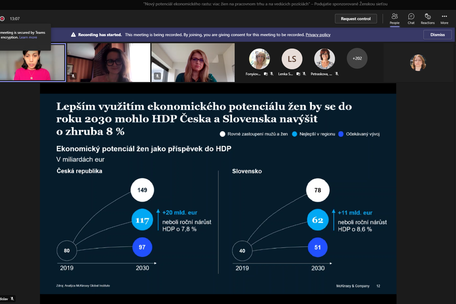 Na online prednáške ženskej siete 17. marca sa hovorilo najmä o tom, aký ekonomický prínos má vyššie zapojenie žien na pracovnom trhu. Výsledky štúdie spoločnosti McKinsey z roku 2021, ktorá bola pozitívne prijatá na viacerých medzinárodných fórach, prišli prezentovať dve mladé vzdelané ženy: Helena Šarkanová a Dagmar Melbø. „Sú nielen úspešné manažérky, ale aj manželky a matky, ako mnohé z nás,“ predstavila ich viceprezidentka Elena Petrašková. Štúdia skúmala potenciál žien v strednej a východnej Európe v porovnaní s inými regiónmi, kde za top môžeme považovať škandinávske krajiny. Uvádzame zopár zistení: