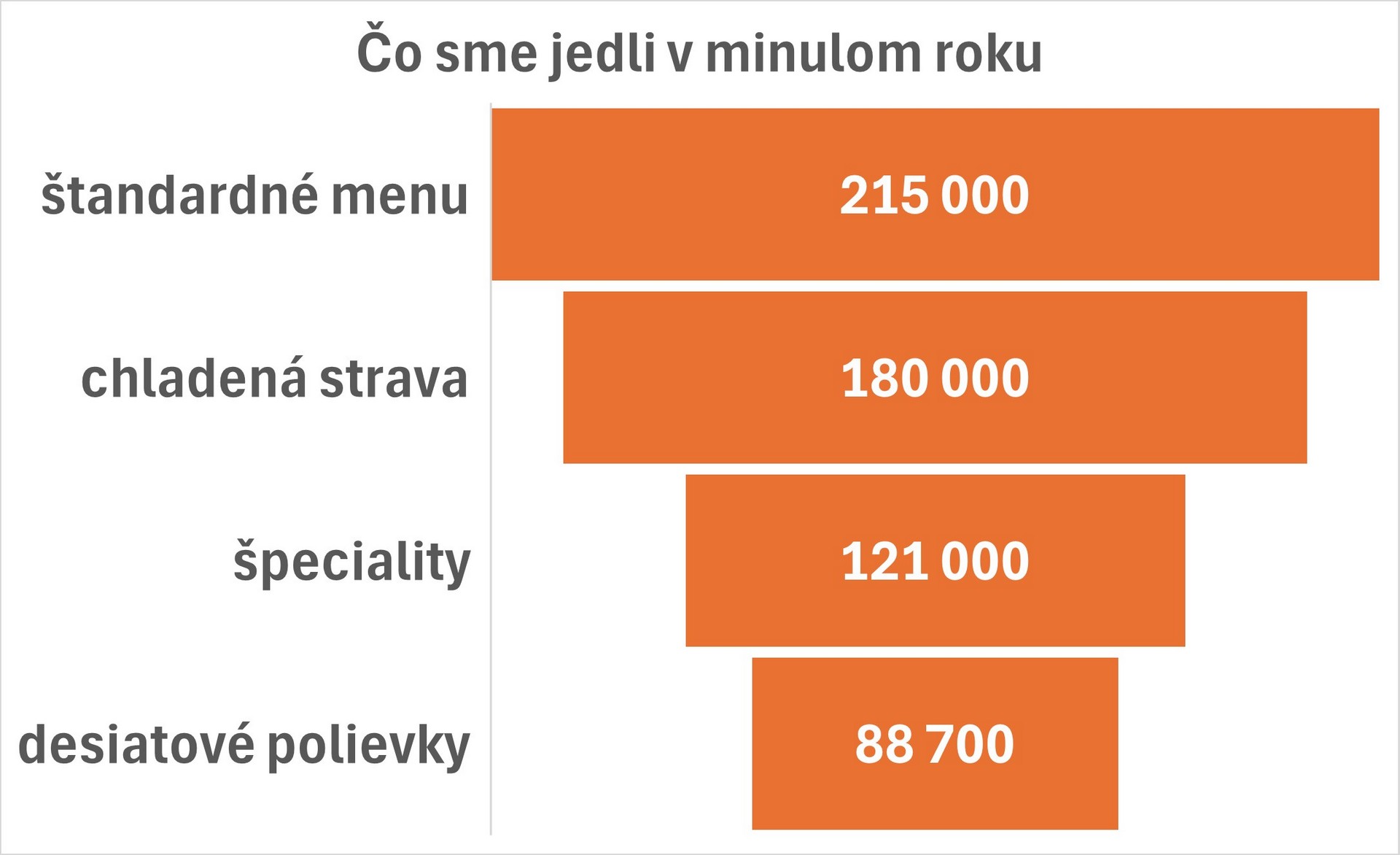 V troch jedálňach a dvanástich bufetoch v areáli nášho podniku sme v minulom roku zjedli viac ako 215 000 porcií štandardného menu, 121 000 porcií špecialít, 180 000 porcií chladenej stravy a takmer 88 700 porcií chladenej desiatovej polievky, z toho až štvrtinu porcií tvorila držková. Spolu sme tak zjedli 605 000 porcií jedál.