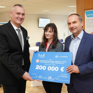 Symbolický šek na 200 tisíc eur odovzdali riaditeľovi Vysokošpecializovaného odborného ústavu geriatrického sv. Lukáša v Košiciach Jurajovi. Sýkorovi riaditeľ pre Vonkajšie vzťahy Ján Bača a správkyňa Nadácie U. S. Steel Košice Slávka Tvrdoňová.