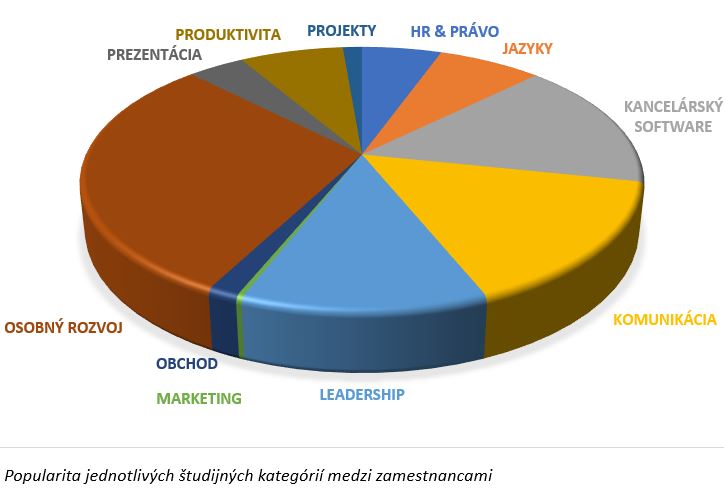 Online kurzy umožňujú časovú flexibilitu, študenti ich môžu robiť vlastným tempom. Sú rozdelené do kategórií. Našich zamestnancov najviac zaujímajú kurzy z oblastí Osobného rozvoja, Komunikácie a Leadershipu.