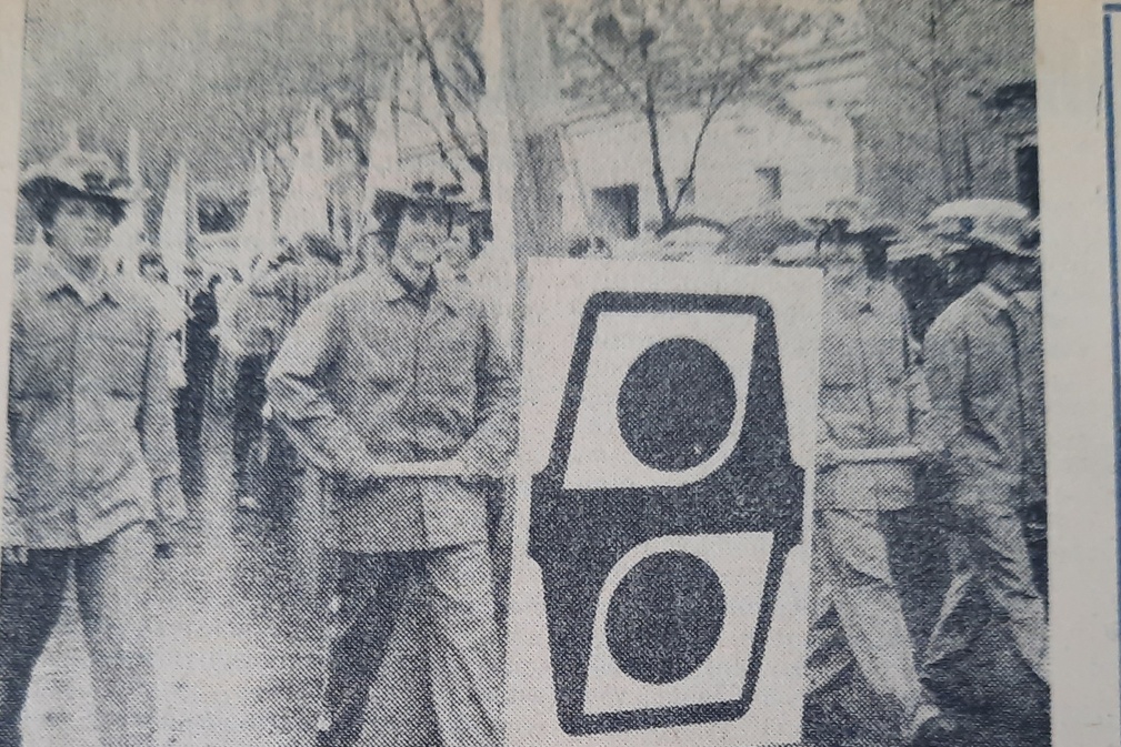 „Na čele hutníkov v prvomájovom sprievode osláv Sviatku práce kráčali učni z nášho odborného učilišťa so znakom materského podniku. Za nimi pracovníci našich závodov, ktorí neskrývali hrdosť za pracovné výsledky dosiahnuté v uplynulom roku.“