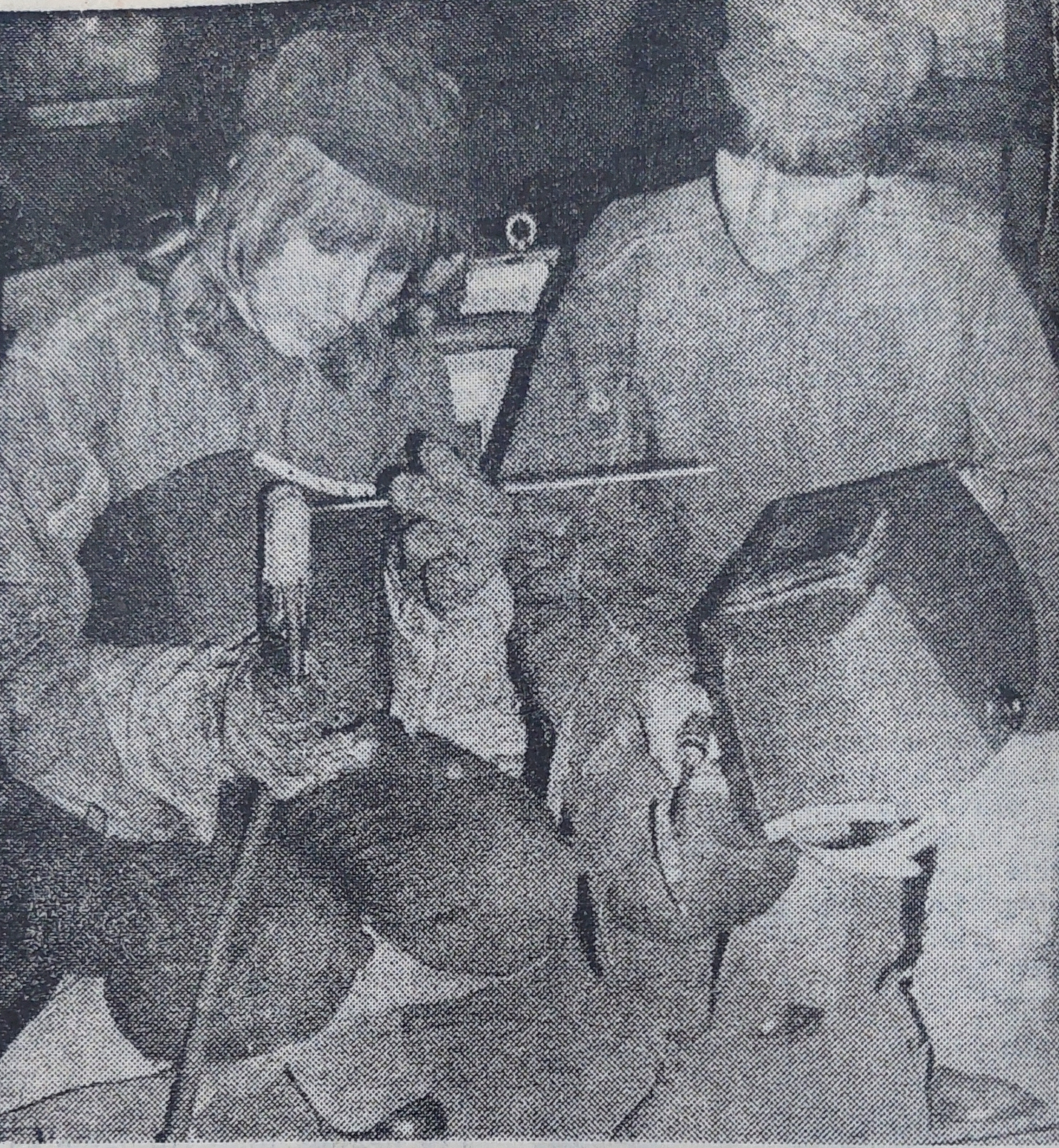 Dievčatá povolania mechanik opravár pre stroje a zariadenia od majstra L. Žoldáka sa musia naučiť aj zvárať elektrickým oblúkom. Na snímke si túto operáciu skúšajú Iveta Dužárová a Erika Ráczová.