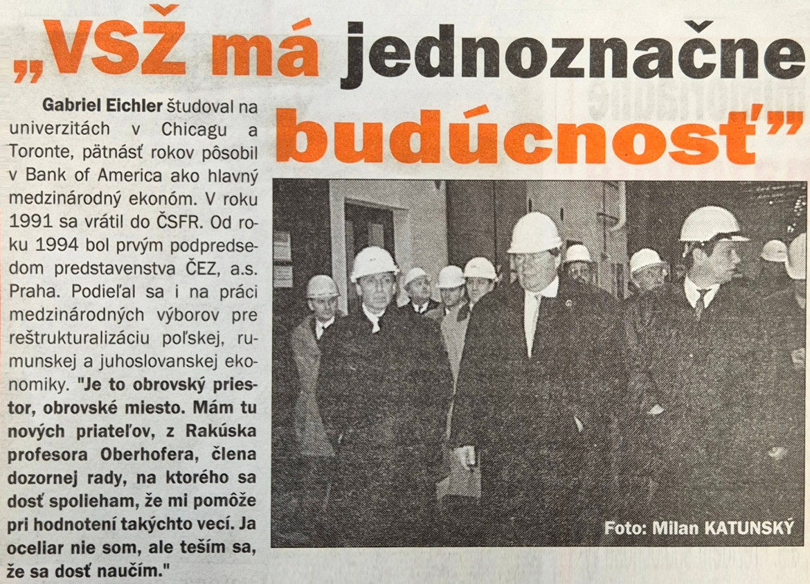 Prvé kroky Gabriela Eichlera, člena predstavenstva a Alberta Oberhofera, člena dozornej rady VSŽ HOLDING, a.s. viedli bezprostredne po skončení piatkového mimoriadneho valného zhromaždenia do huty. V sprievode generálneho riaditeľa spoločnosti VSŽ OCEĽ s r.o. Viliama Harčára si prezreli vysokú pec č. 3, konvertory a zariadenie na plynulé odlievanie ocele do brám v Oceliarni II a lakoplastovaciu linku v divíznom závode Studená valcovňa. Obidvaja novozvolení vrcholoví predstavitelia VSŽ sa zaujímali o technickú úroveň výrobných zariadení, ich vplyv na životné prostredie, pracovné podmienky zamestnancov i o kapacitné možnosti agregátov, ktoré videli. Položili sme i otázku, ktorú si v týchto dňoch kladú mnohí železiari. Má VSŽ budúcnosť? „Áno, áno. Jednoznačne. V Európe je spotreba ocele takmer päťsto kilogramov na osobu ročne. V krajinách strednej Európy, ako Poľsko, Maďarsko, Česko, Slovensko je to vyše sto kilogramov na jedného obyvateľa. Tento trend jasne dokazuje, že je tu miesto pre takúto fabriku.“