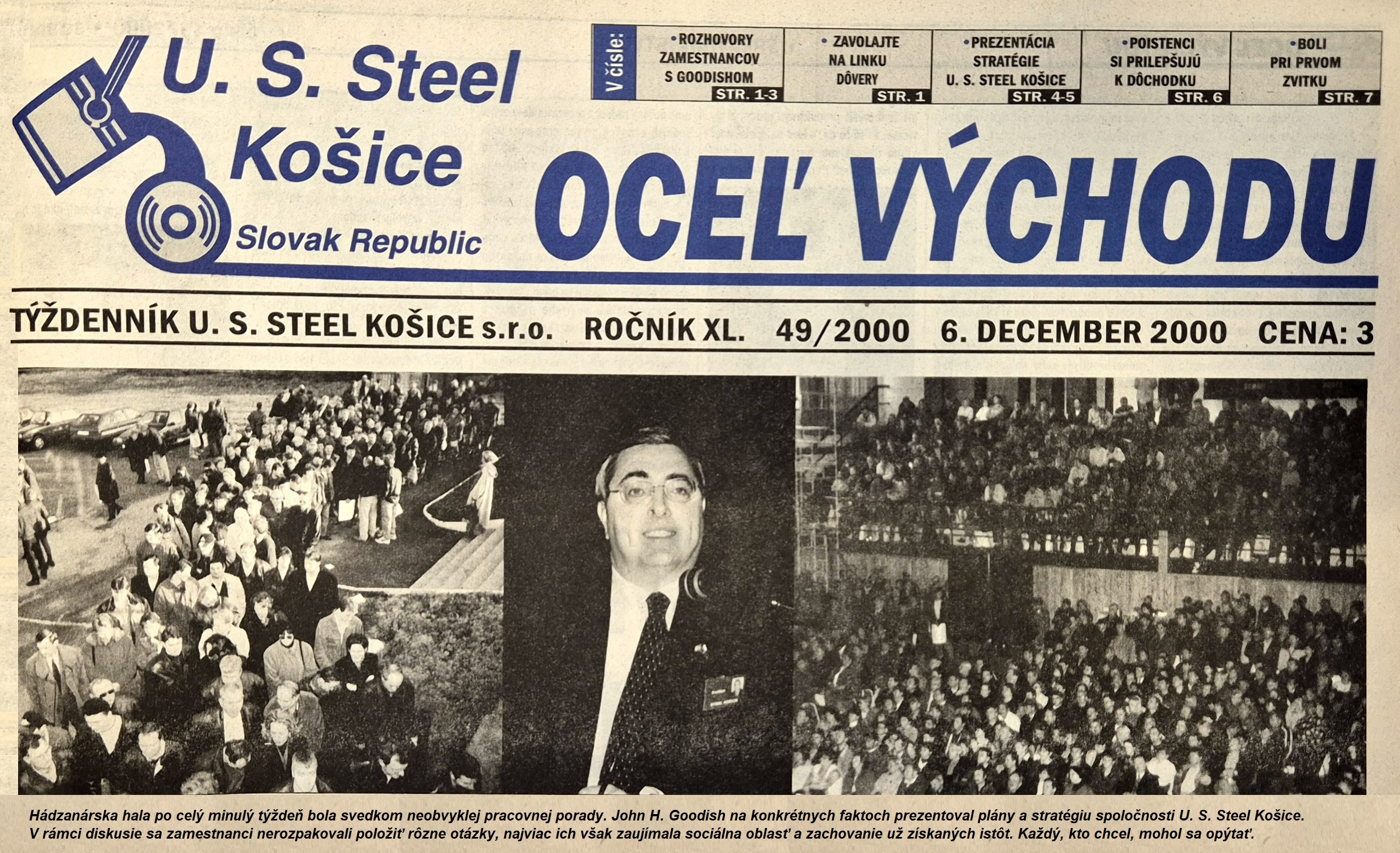 Hádzanárska hala po celý minulý týždeň bola svedkom neobvyklej pracovnej porady. John H. Goodish na konkrétnych faktoch prezentoval plány a stratégiu spoločnosti U. S. Steel Košice. V rámci diskusie sa zamestnanci nerozpakovali položiť rôzne otázky, najviac ich však zaujímala sociálna oblasť a zachovanie už získaných istôt. Každý, kto chcel, mohol sa opýtať.