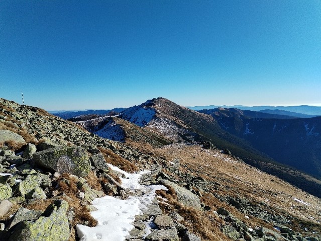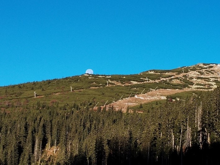 Zaparkovali sme na parkovisku Trangoška a vydali sa na Chopok po žltej turistickej značke. Našu cestu sprevádzal krásny západ mesiaca za kopce a ešte krajší východ slnka. Po príchode na Chopok nás privítal chladný vietor, ale nevadilo nám to, lebo slniečko hrialo a boli sme dobre oblečení. Po krátkej pauze na fotenie sme sa vydali po hrebeni smerom na Ďumbier, po červenej turistickej magistrále hrdinov SNP. Cestou sme stretávali turistov, ktorí si, podobne ako my, chceli ešte vychutnať posledné slnečné dni v horách.