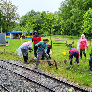 We postponed the beginning of our brigade on the Children's Historical Railway by half an hour, but even so, almost all of us met at 8 o'clock. Despite the bad weather, 15 of us stayed and together with 11 volunteers from the railway we created a great group.