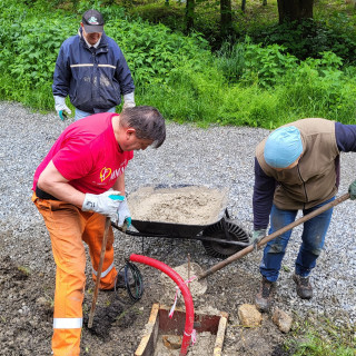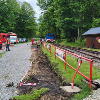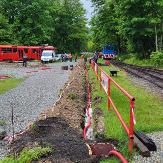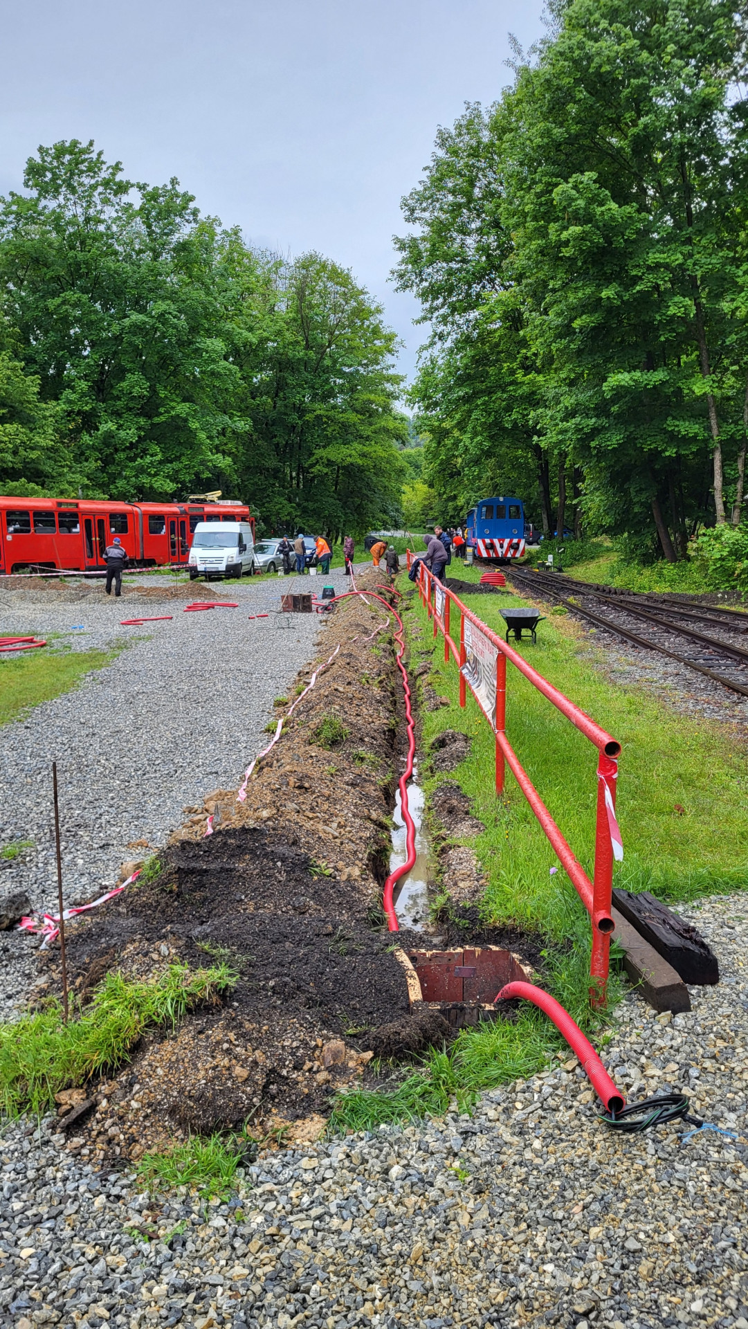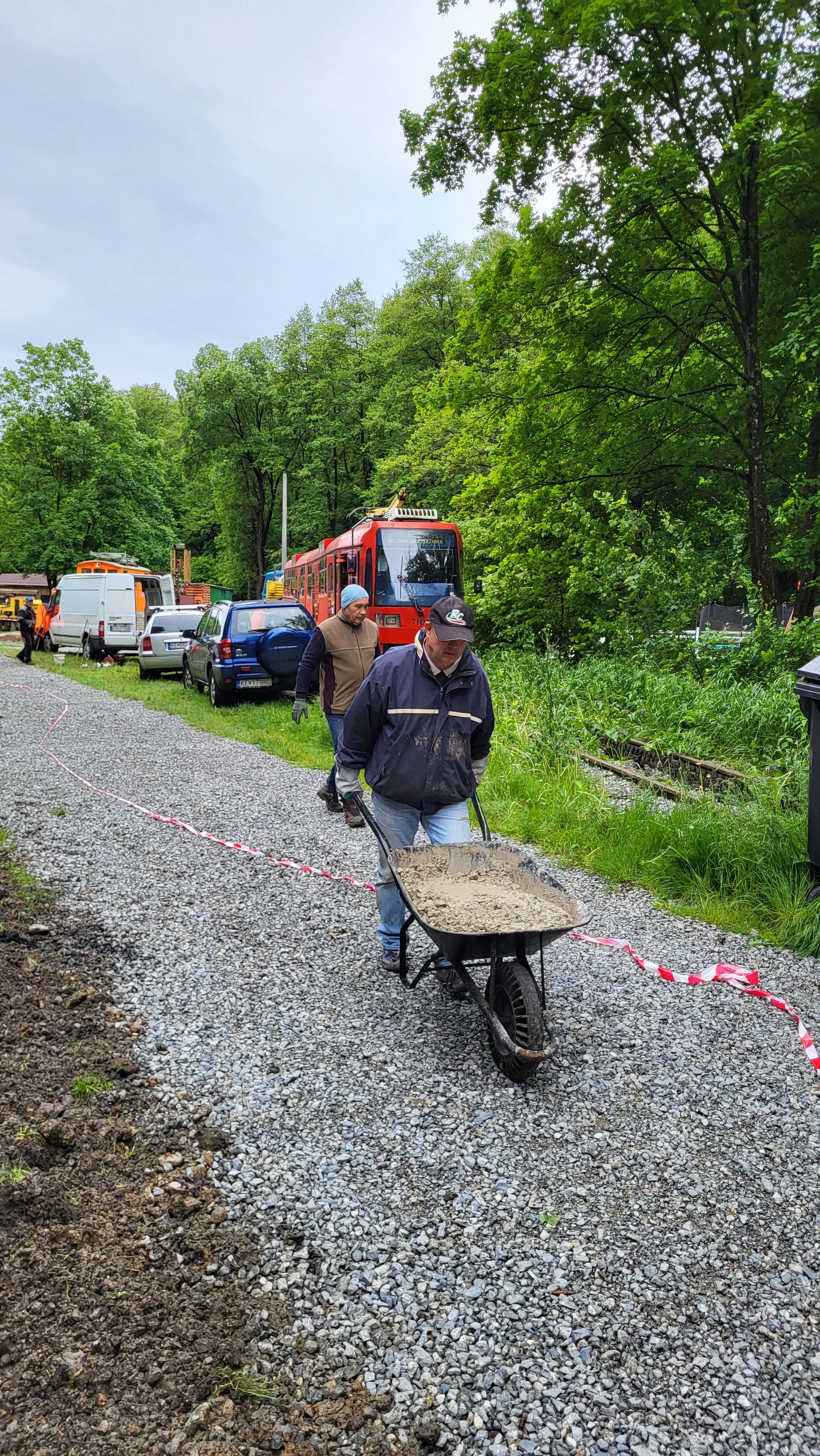 Marcel Novosad, Stano Ferencak, Robert Zihlavnik, Roman Fedak, Robert Jenik, Igor Molnar, Dusan Bakon, Michal Tancak and Fero Gregor immediately set about completing the excavations for the electrical connection, its installation and subsequent burial. The electrical connection will be used to illuminate the sidewalk from the Alpinka station to the children's area and to the tram, which is part of the exhibits. We learned that it used to roam the streets of Bratislava (Bratislava, unlike Košice, has a narrow gauge, the same as our Children's Historical Railway).