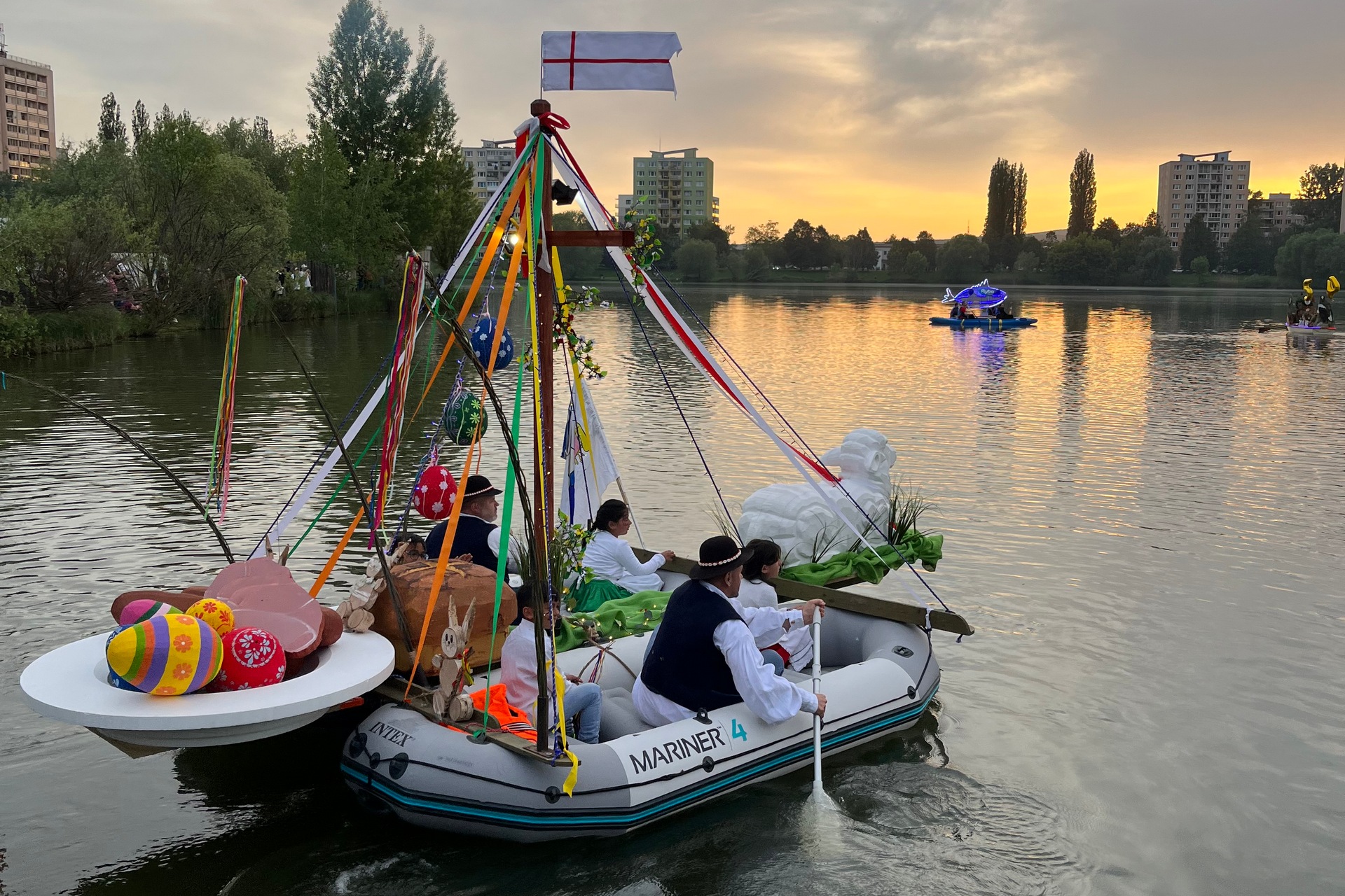 Our friends from Podolínec, in whose performance we experienced and admired such themes as the Tree of Life, Kubko and Maťko, Gypsies Go to Heaven, or Wedding, decided this time to depict an Easter theme called New Life. Their boat was dominated by lamb, there were Easter eggs, ham, and sausages. And not only those made of polystyrene, they also brought real ones with them and offered them to passers-by. Štefan Straka, director of the orphanage, was enthusiastic about the idea. Several colleagues and children were involved in the preparation. The preparation itself took almost a month, intensively devoted to it for the last week. What will happen to the decorations after the end of Venice in Košice? They do not know yet, they will definitely use them to decorate next year's Easter holidays. After all, even the Tree of Life from past Venice adorned the grounds of the home for almost a year.