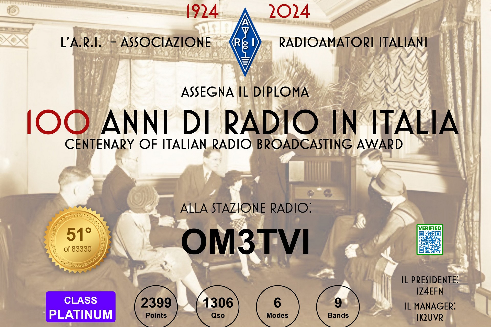 He remained faithful to radio amateurism and also participates in various competitions. Last year, he took part in a competition to mark the centenary of radio broadcasting in Italy. On the diploma, in the lower left corner, it is stated that it was 51st out of 83,330 stations evaluated. ( OM3TVI is a license - a brand of Ján Hidaši)