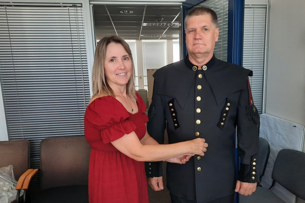 Na snímke je Renáta Drcová z krajčírskej firmy zo Svidníka, ktorá kontroluje, ako uniforma „sedí“ Vladimírovi Molčanovi z DZ Koksovňa.
