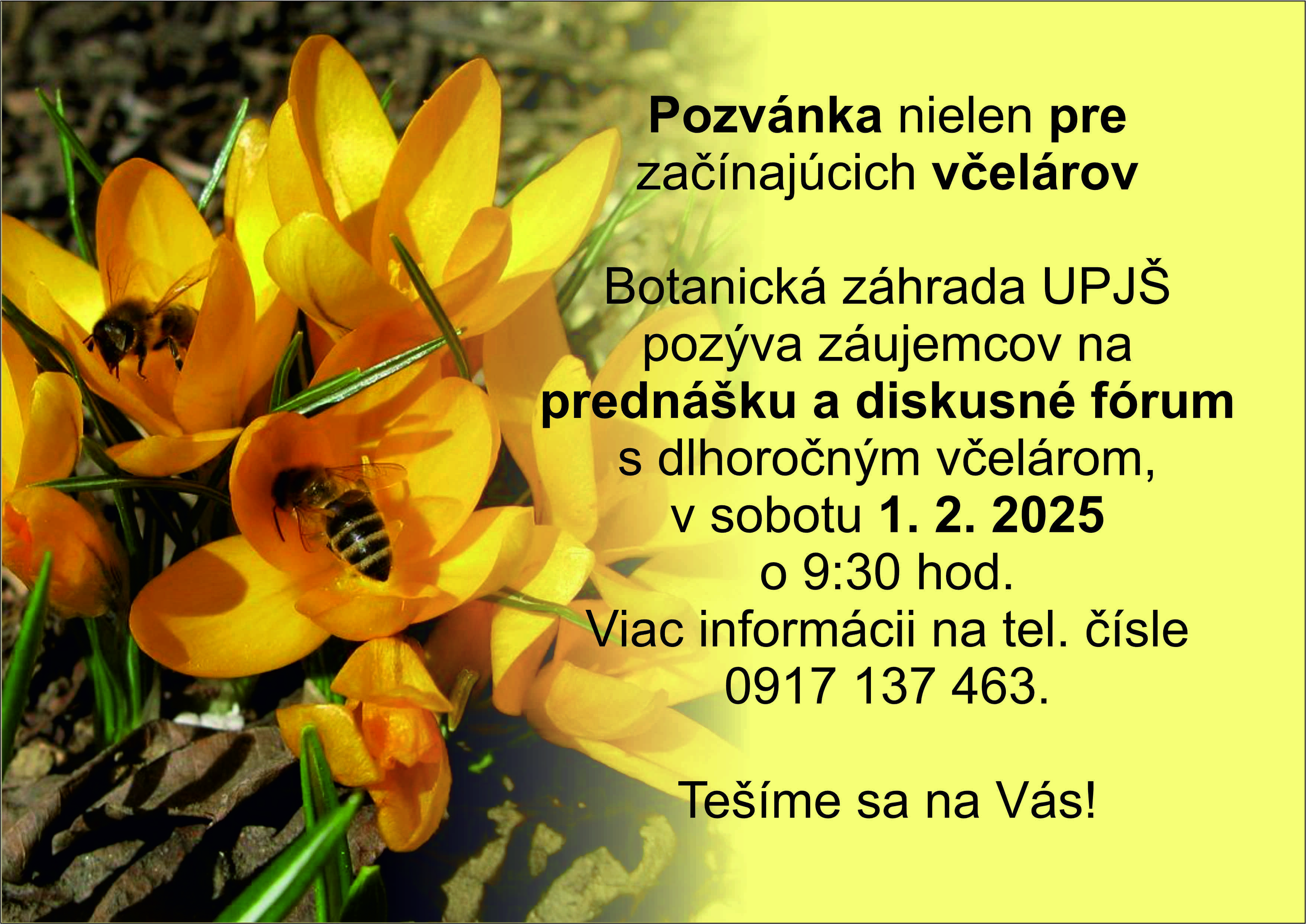 Botanická záhrada UPJŠ v Košiciach Vás pozýva na prednášku a diskusné fórum včelárov, ktoré sa uskutoční v sobotu 1. februára 2025 v čase od 9:30 do 12:30 hod. v prednáškovej miestnosti na poschodí v budove botanickej záhrady. Podujatie je určené pre širokú verejnosť a je potrebné si zakúpiť bežné vstupné .