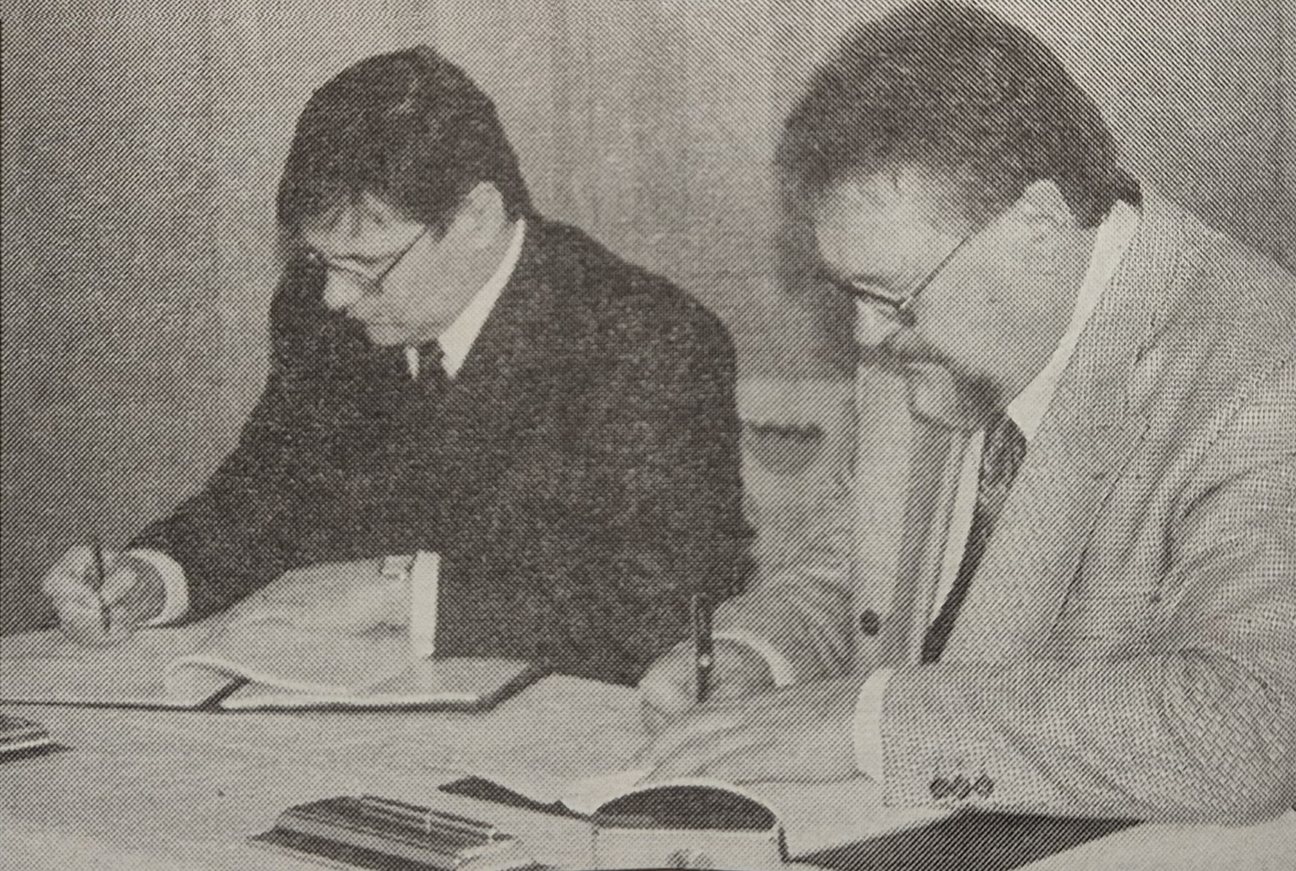 Na fotografii riadiaci pracovníci holandskej firmy Hoogovens. Za našu stranu rokovania viedol Ing. Marián Siegfried, vedúci odboru strategického plánovania divízie Ocel.