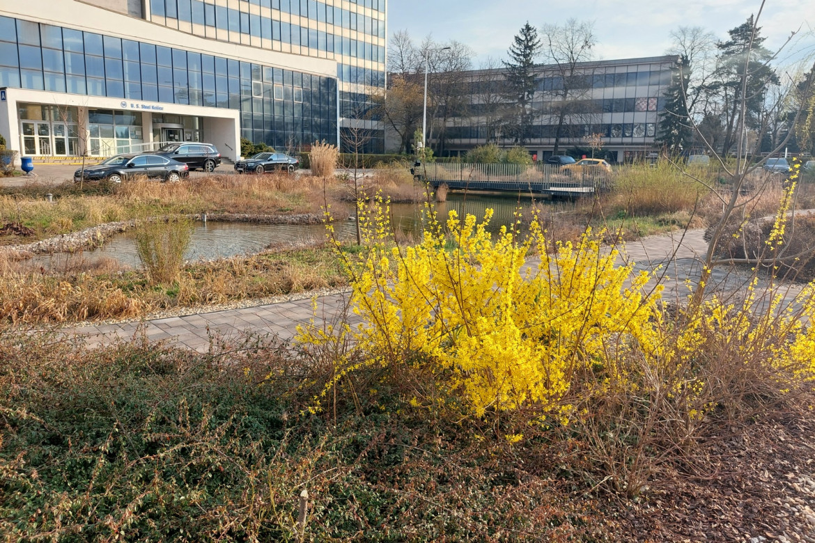 Pred novou sezónou je potrebné vyčistiť celú plochu výsadieb, odstrániť odkvitnuté trvalky, ktorých nadzemné časti sú suché, no pod nimi sa už rodia nové porasty. Niektoré kríky podrobíme strihu, iné druhy necháme vykvitnúť a budeme sa im venovať až v lete. Počas zimy sme okolo jazierka ponechali mnoho z tráv, pre efekt so srieňou aj námrazou. Tie už vyčerpali svoj potenciál a je potrebné ich odstrániť, aby vedeli nanovo rašiť.