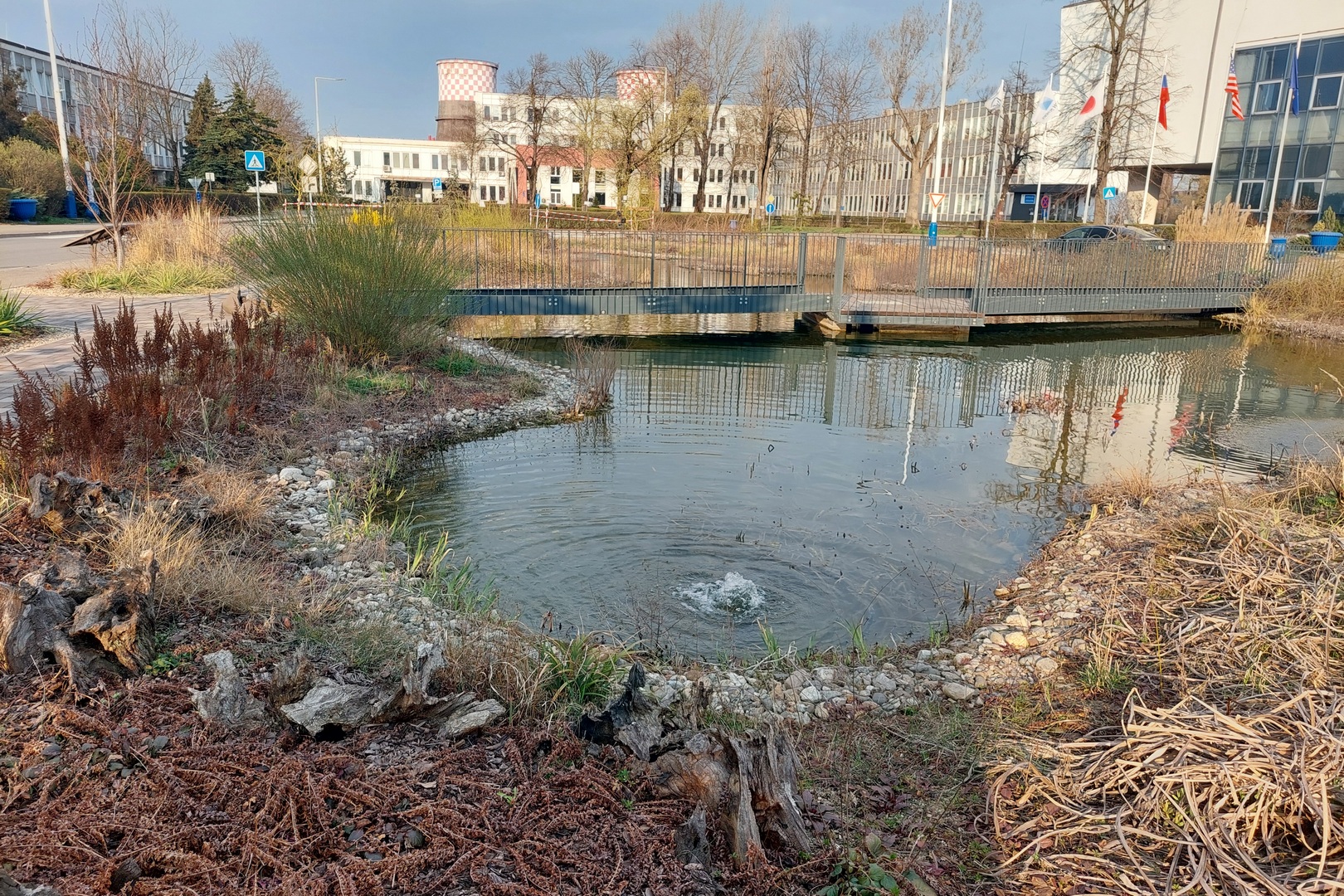 V jazierku ešte vodné rastliny nevyvíjajú nejakú veľkú aktivitu. V tomto období poväčšine ešte spia, uvidíme, ako budú nastupovať do sezóny. Naším cieľom nie je vytvárať jazierko vo forme kúpacieho bazénu, ale prírodného biotopu, kde je aj ten prirodzený opalizujúci zákal v poriadku. Dôležité je, aby voda bola senzoricky v prijateľnej kvalite, aby obsahovala dostatok kyslíka a ponúkla aj dostatok prirodzeného zázemia pre rozvoj rýb. Momentálne je spustený aj podporný systém čerpania a odkaľovania vody, takže základné funkcie sú v poriadku.