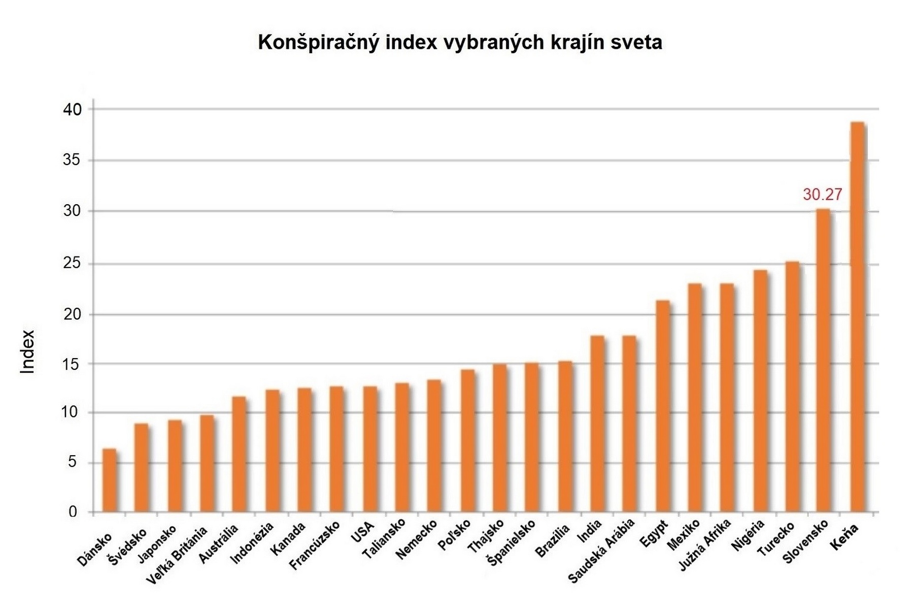 Z prieskumu vyplynulo, že na Slovensku je konšpiračný index extrémne vysoký. Slovensko sa tak v akceptácii konšpirácií radí ku krajinám ako Mexiko či Turecko a žiaľ máme bližšie ku Keni či Južnej Afrike ako k vyspelým krajinám sveta. V štúdii francúzskych vedcov publikovanej vo vedeckom časopise Social Science Information najvyššiu hodnotu konšpiračného indexu až 38 mala Keňa a Južná Afrika, 25.3 malo Turecko, Japonsko alebo Spojené kráľovstvo majú index 8-9 a na opačnej strane má najnižší index Dánsko, iba 6.3. Na Slovensku dosahuje konšpiračný index hodnotu 30,27, čo je jedna z úplne najvyšších hodnôt zo všetkých krajín, kde sa prieskum podľa tejto metodiky doteraz realizoval.
