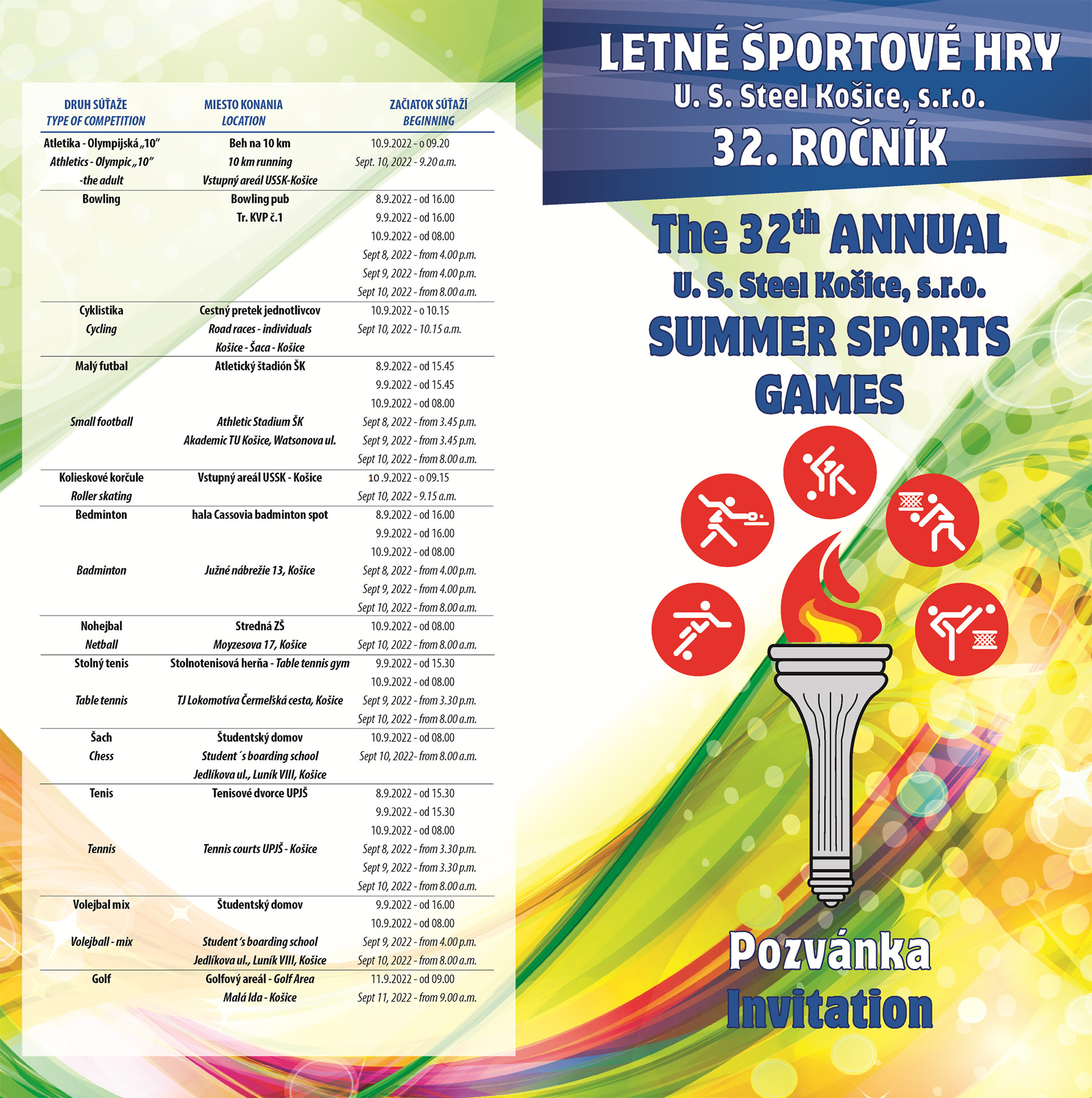 Vážení športoví priatelia, termín Letných športových hier USSK je naplánovaný na 8. - 10. septembra 2022 a turnaj v golfe 11. septembra 2022. Organizačné zabezpečenie, propozície a rozpisy jednotlivých športov, ako aj záväzné prihlášky nájdete na intranete v sekcii Šport alebo na internete. V ostatných rokoch nastal problém so zabezpečením počtu družstiev v malom futbale a volejbale mix, preto prosíme záujemcov o tieto športy, aby sa hlásili u svojich členov organizačného výboru LŠH na jednotlivých závodoch, ktorí potom zabezpečia prihlášky.