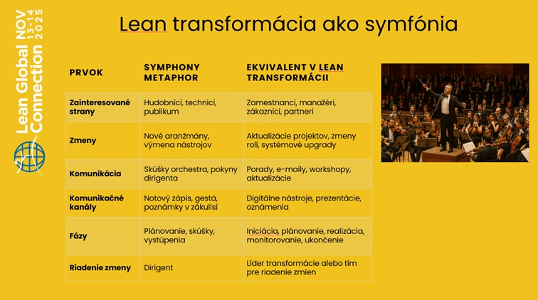 „Venovala som sa téme, ktorú považujem za skrytú silu každej (nielen lean) transformácie, ktorou je change management (riadenie zmien). Hovorila som o tom, akú úlohu má v transformačných a lean projektoch. Lean a transformácia nie sú len o procesoch a nástrojoch. Sú najmä o ľuďoch, ich obavách, emóciách a schopnosti prijať zmenu. Z vlastnej, viac ako 20 ročnej praxe viem, že práve práca so zmenou a s emóciami ľudí rozhoduje o tom, či bude transformácia úspešná a udržateľná. Mnohé projekty zlyhávajú nie preto, že by boli technicky zlé, ale preto, že ľudia neboli na zmenu pripravení. Obavy, neistota a odpor sú prirodzené. Ak s nimi nepracujeme, projekty sa časom vracajú do „starých koľají“. Pre lepšie pochopenie uvedeného som v úvode prednášky použila metaforu jazdca a slona. Jazdec predstavuje rozum – logické argumenty, prečo zmenu robíme. Slon symbolizuje emócie, obavy a strach z neznámeho. Ak sa sústredíme len na jazdca a ignorujeme slona, transformácia sa nám nepodarí – slon je totiž silnejší. Aj naša ERP transformácia, ktorá zasiahla viac ako 3 000 koncových užívateľov potvrdila, že bez systematického change managementu od začiatku nie je udržateľná zmena možná.“