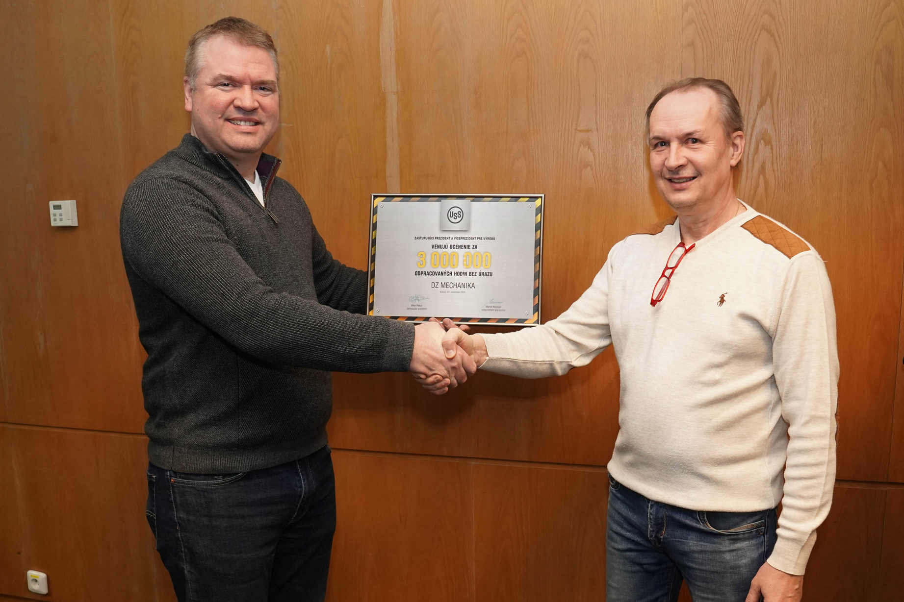 Zastupujúci prezident Mike Piekut, viceprezident pre výrobu Marcel Novosad a GM pre bezpečnosť a ochranu Robert Meitner dnes odovzdali diplom a symbolicky aj tričko riaditeľovi DZ Mechanika Jurajovi Prokeinovi k významnému míľniku, ktorý tento závod dosiahol 29. novembra minulého roka.