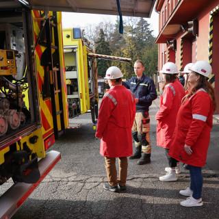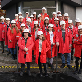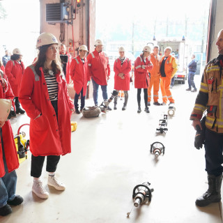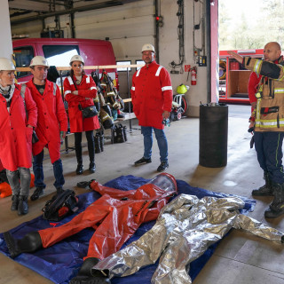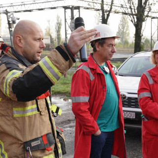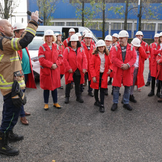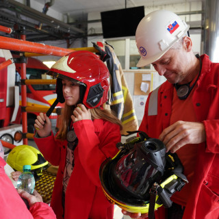 Po úvodnom filme a bezpečnostnom školení si každý z účastníkov obliekol potrebné ochranné pomôcky. To bolo dôvodom na prvé úvodné fotenie v prilbe, ochrannom červenom plášti, či pracovných topánkach s oceľovou špicou.