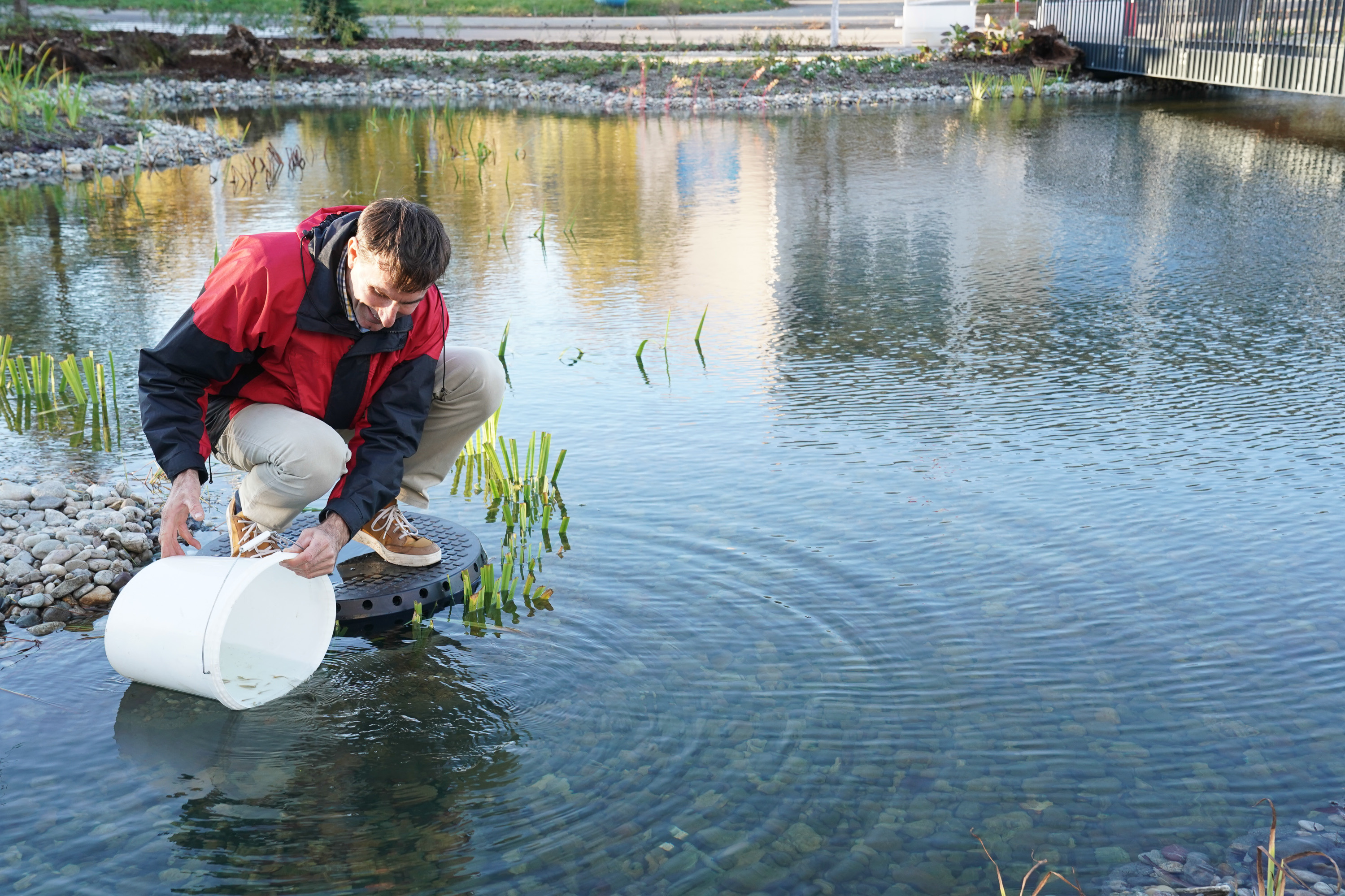 Po stavebnej stránke je dno jazierka riešené stupňovite, pričom najväčšia hĺbka dosahuje 125 cm. Botanici ukotvili niektoré rastliny, napríklad nádherné borovice Armandove, ktoré sa v tomto prostredí ešte nevyskytli, aby mali pri veternom počasí oporu. Technická podpora, ktorou je jazierko vybavené, prispeje spolu s pobrežnými rastlinami k tomu, aby sa hladina vody počas zimy neuzavrela úplne. „V zimnom období nebýva problém s nedostatkom kyslíka pod ľadom, skôr naopak, problém robí nahromadenie metabolických plynov, ktoré nemajú z vody pokrytej ľadom ako odvetrávať,“ vysvetlil Robert Gregorek. Očakáva sa, že voda priláka aj vtáky. Okrem iných napríklad divé kačice. A ktovie, možno tunajší ruch neodradí ani iné druhy. Tak ako napríklad volavku na Mlynskom náhone, ktorá tam v minulosti nikdy nebola.