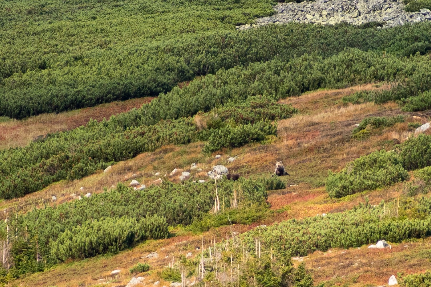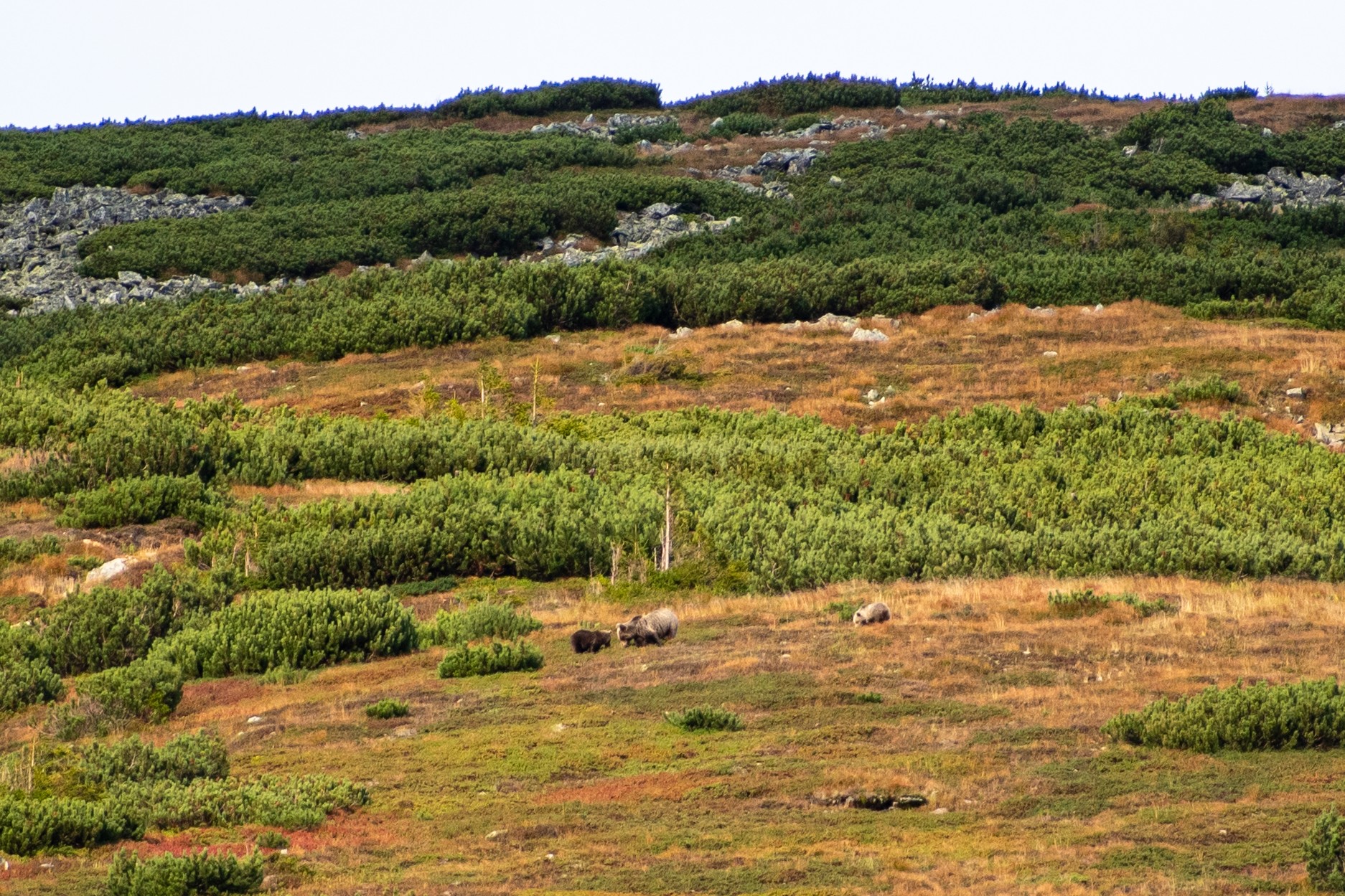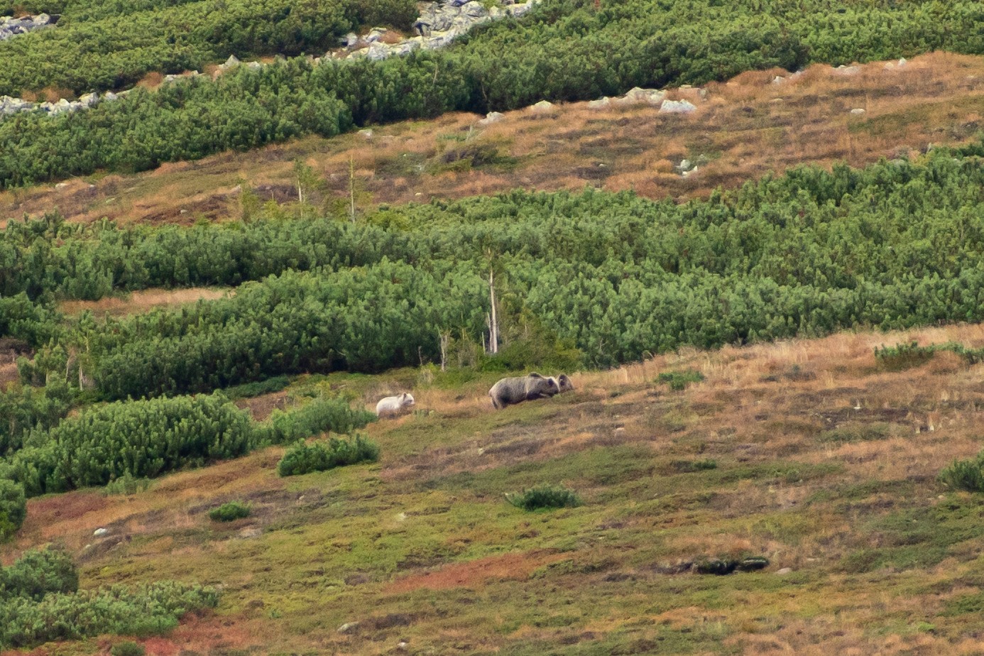 Medvede sú ďalším fascinujúcim obyvateľom Tatier. Hoci sú plaché a väčšinou sa vyhýbajú ľuďom, s trochou šťastia a trpezlivosti ich môžete zahliadnuť. Najlepšie obdobie na pozorovanie medveďov je práve koncom leta, keď sú aktívnejšie pri hľadaní potravy. Tu však už treba mať lepšie oči a trpezlivosť. Ak máte po ruke ďalekohľad, tak si ten zážitok naozaj vychutnáte. Nám sa podarilo nafotiť a pozorovať medvediu rodinku s jedným tmavým a jedným svetlým mláďaťom (mali sme pri sebe iba 300 mm objektív a chcelo by to lepší... ), a tiež dvoch statnejších mackov v zápale kŕmenia sa.